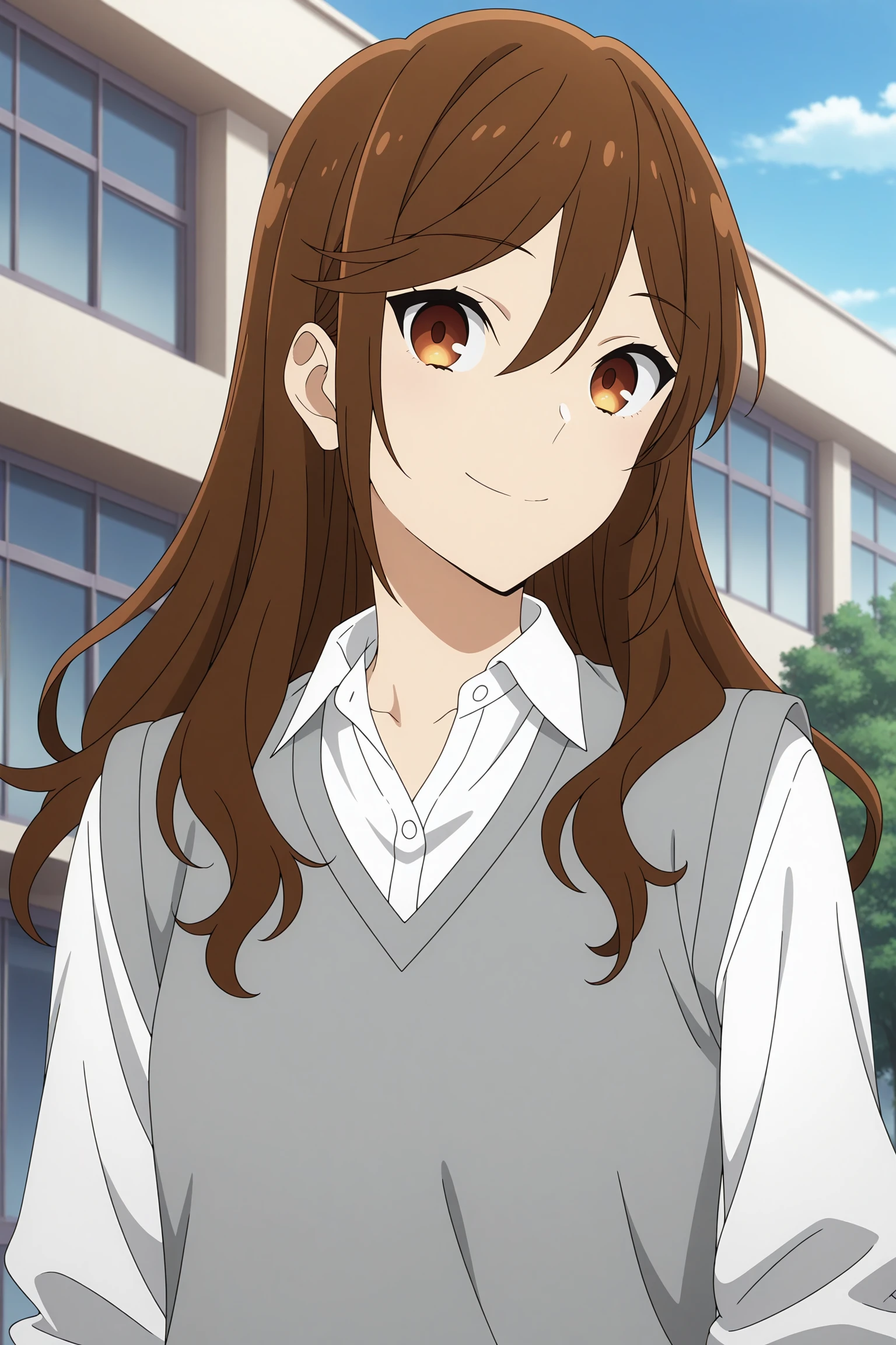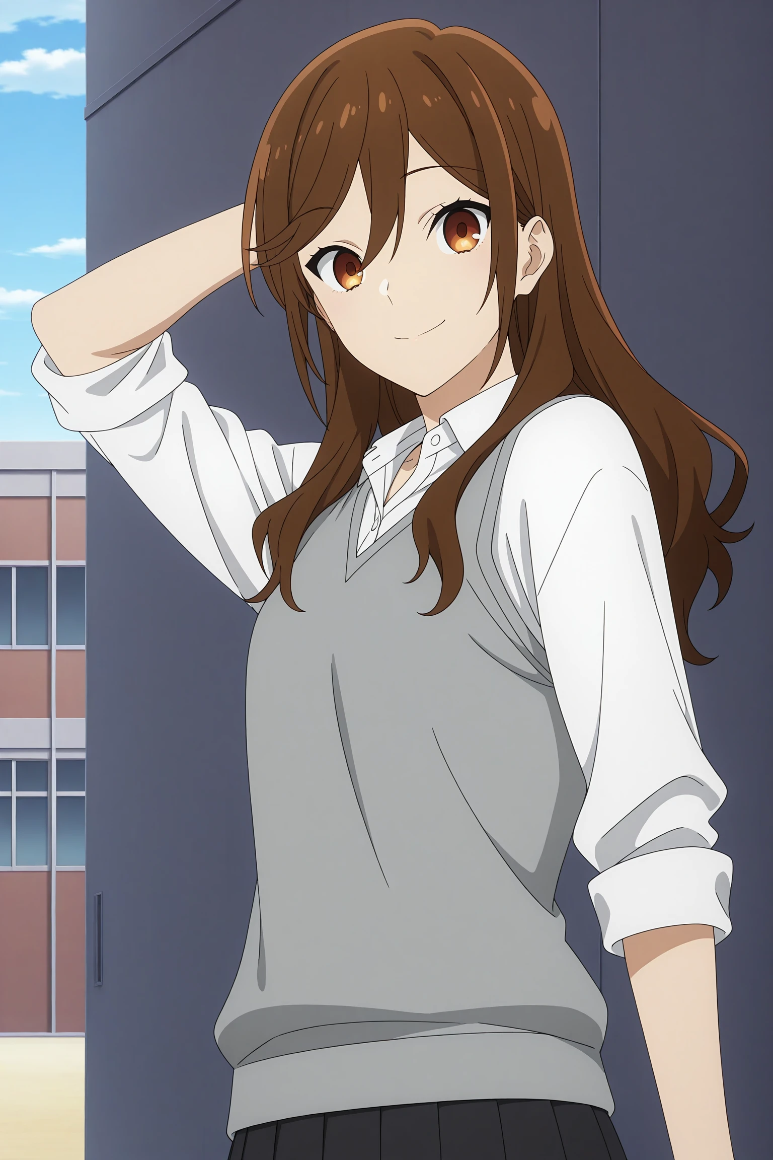 hori kyouko, long hair, brown hair, swept bangs, hair between eyes, sleeves rolled up, grey sweater vest, white shirt, collared shirt, black skirt, pleated skirt, black socks, kneehighs, loafersSchool Uniform 4 (Winter)