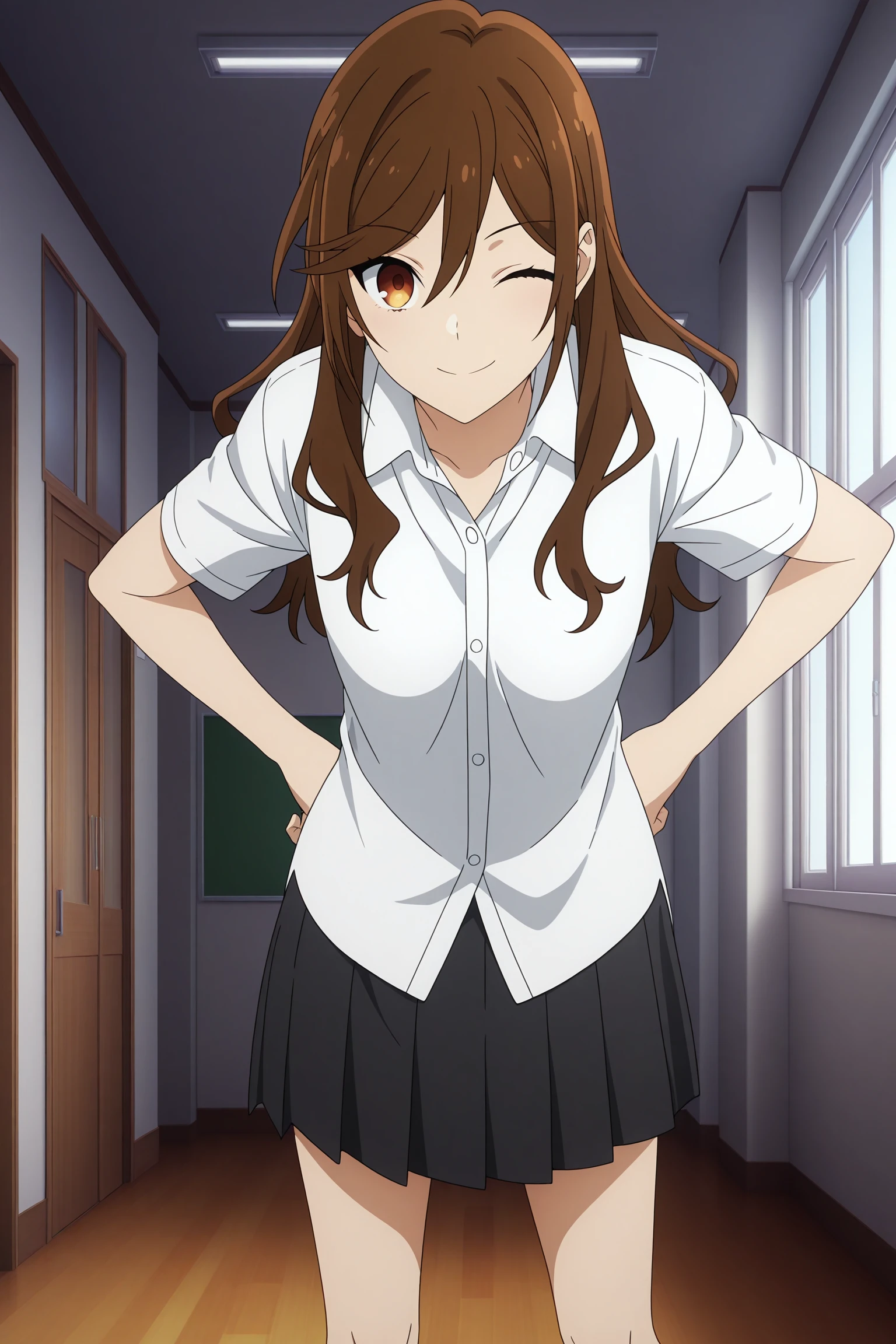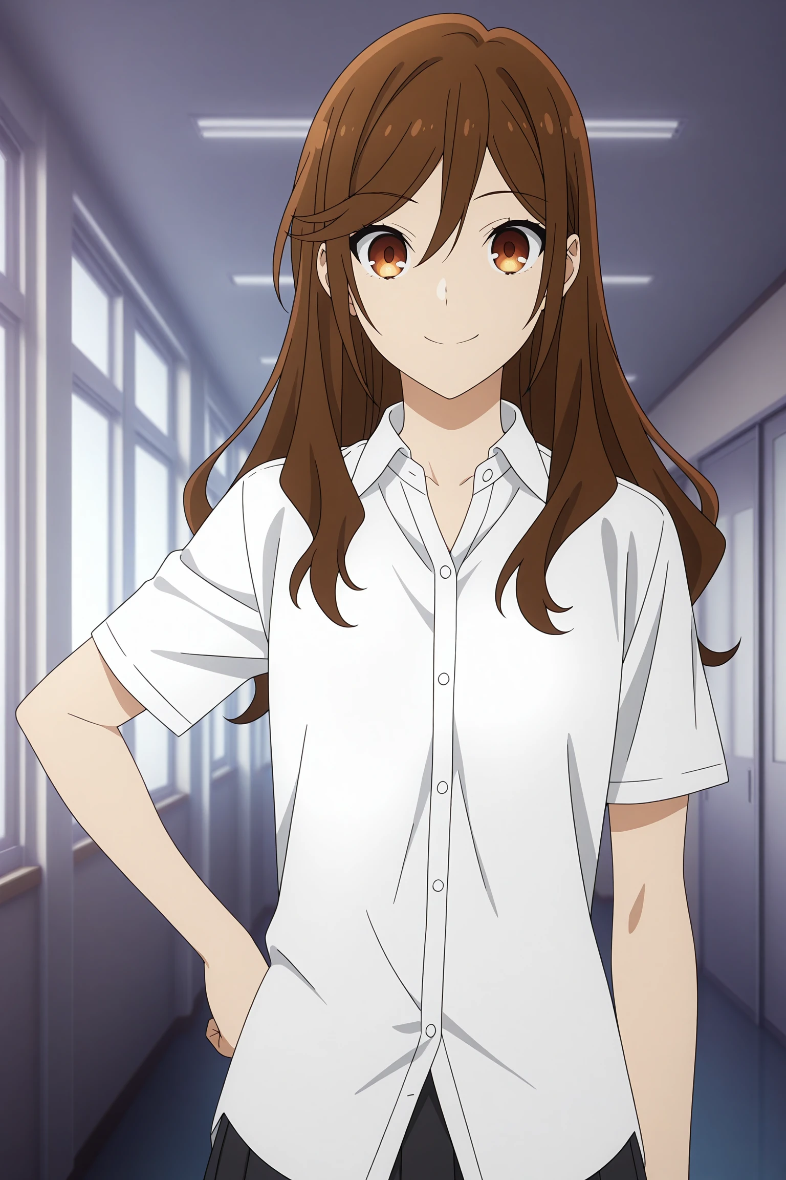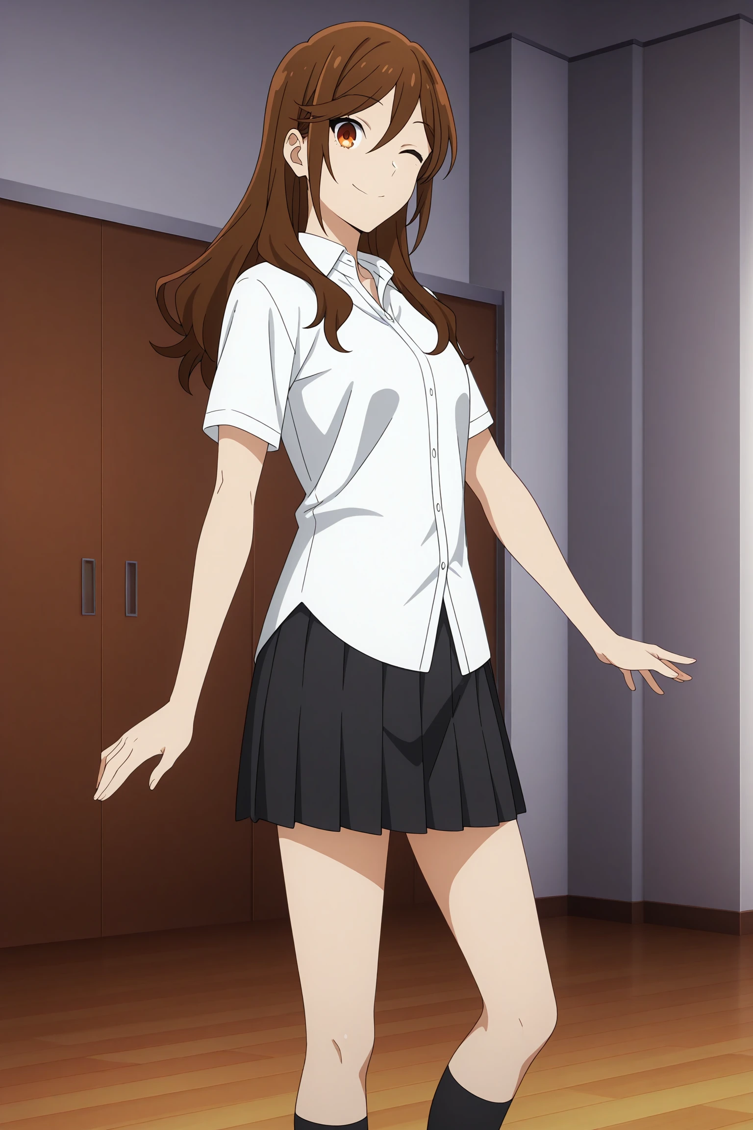 hori kyouko, long hair, brown hair, swept bangs, hair between eyes, short sleeves, white shirt, collared shirt, untucked shirt, black skirt, pleated skirt, black socks, kneehighs, loafersSchool Uniform 3 (Sweater Vest)