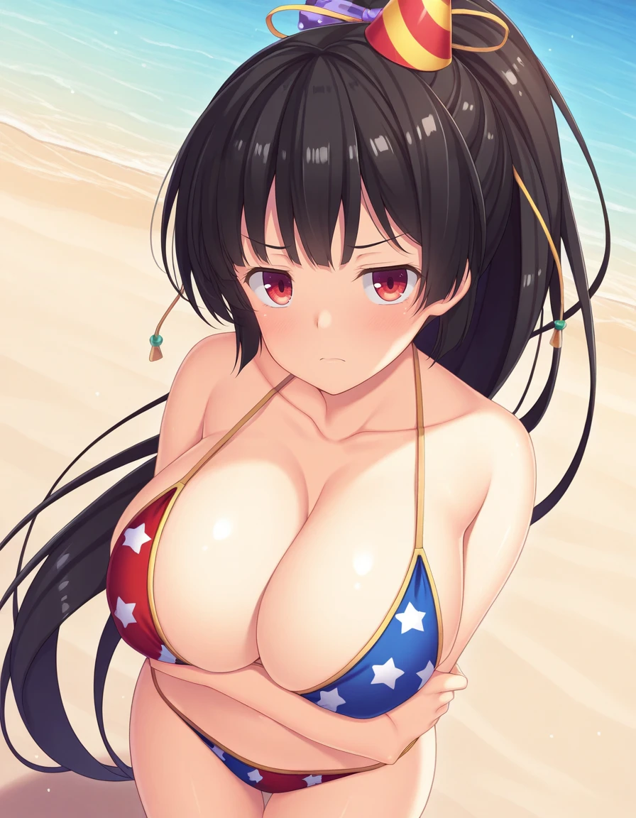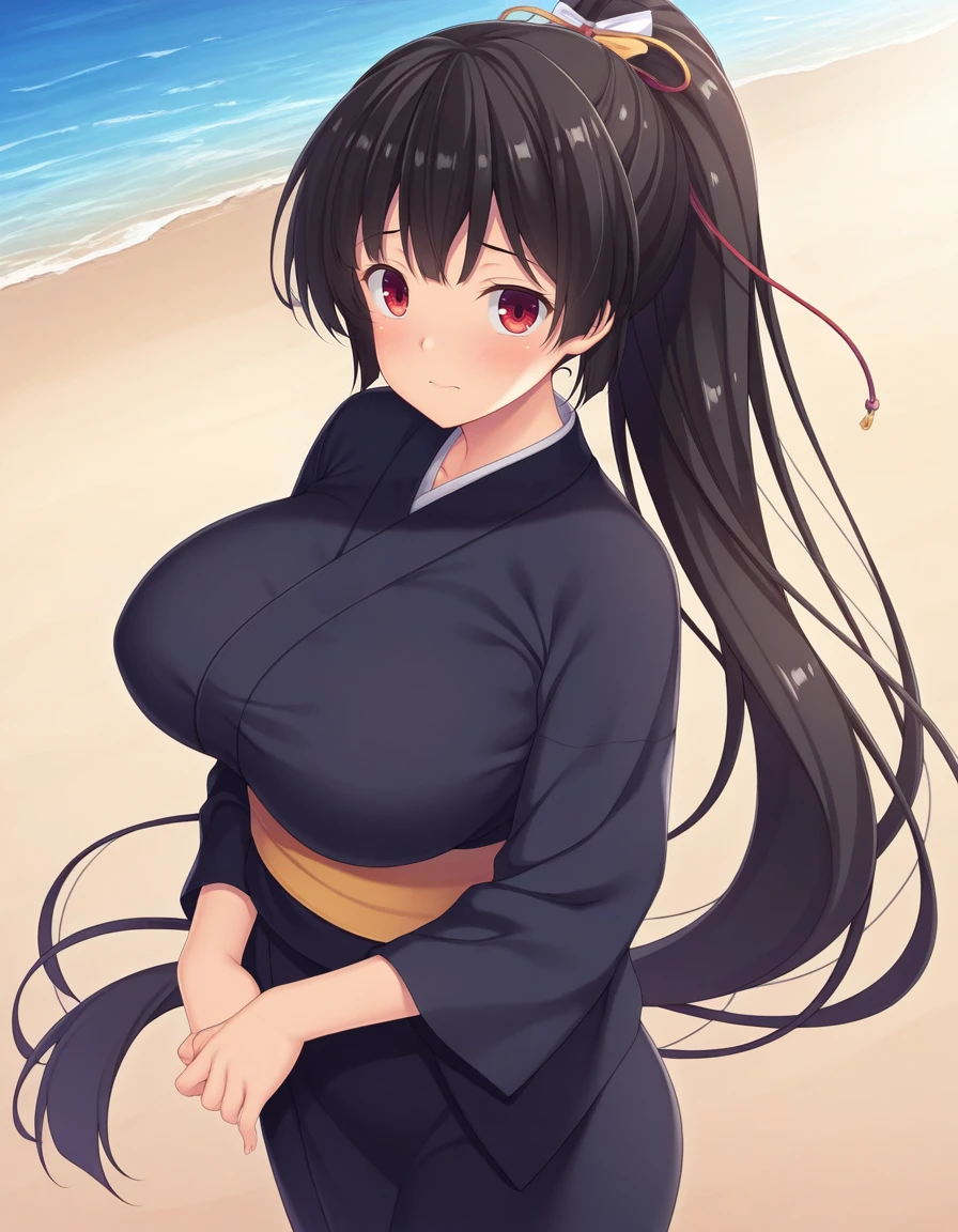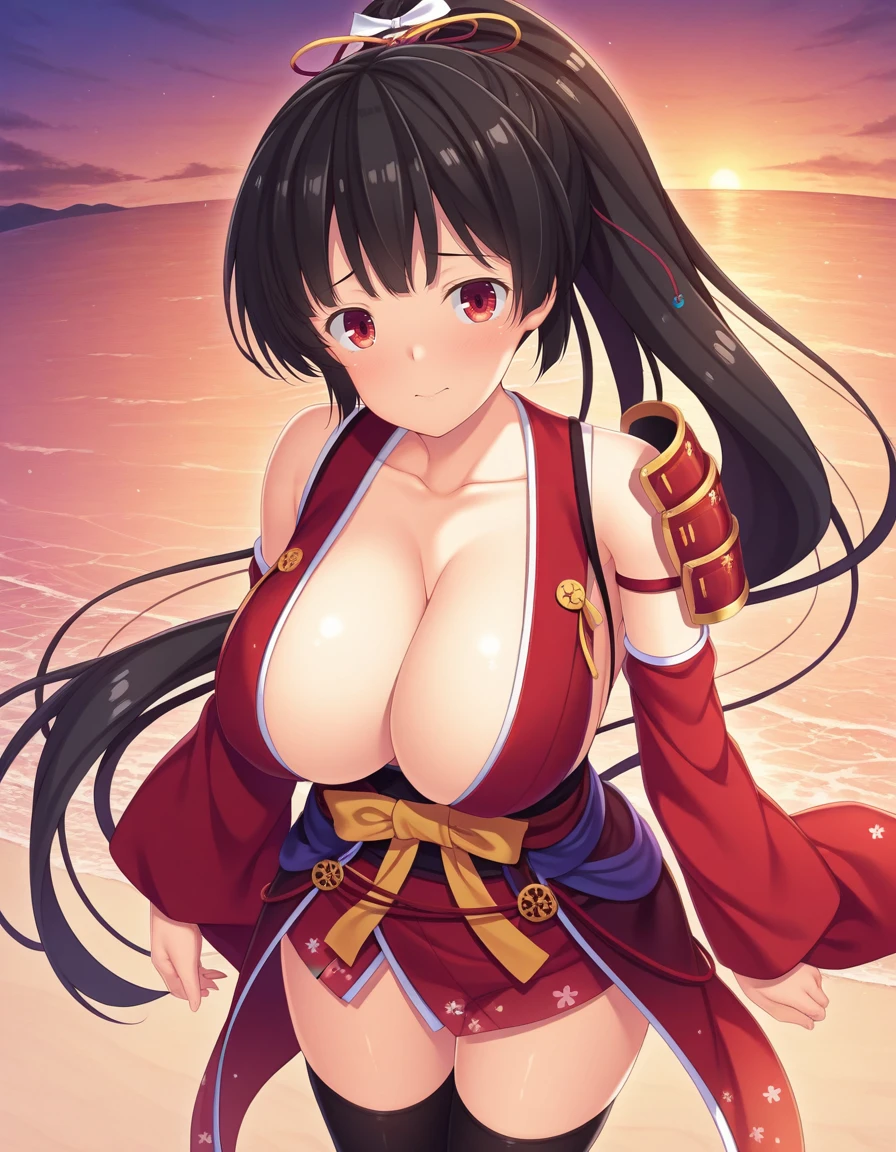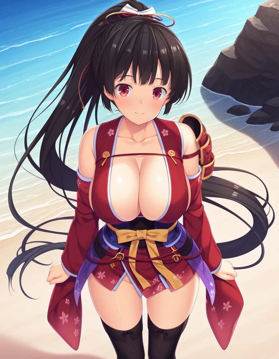red eyes, black hair, ponytail, large breasts, hair ribbon, very long hair, detached sleeves, high ponytail, detached sleeves, japanese clothes, shoulder armor, black thighhighs, sash, single pauldron,