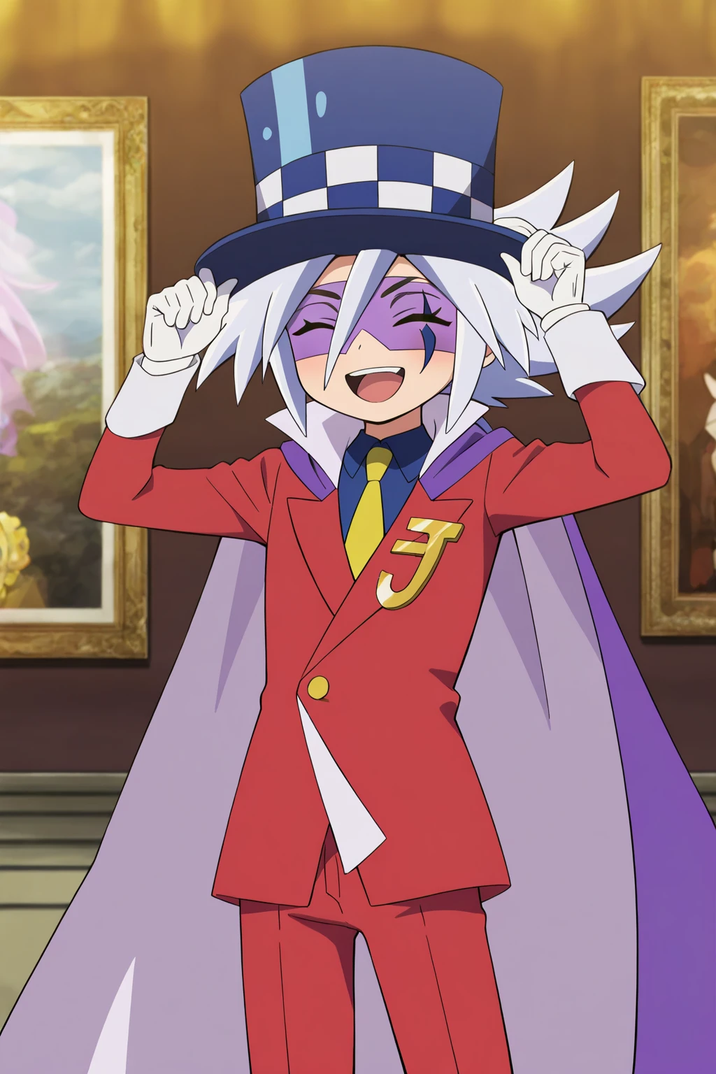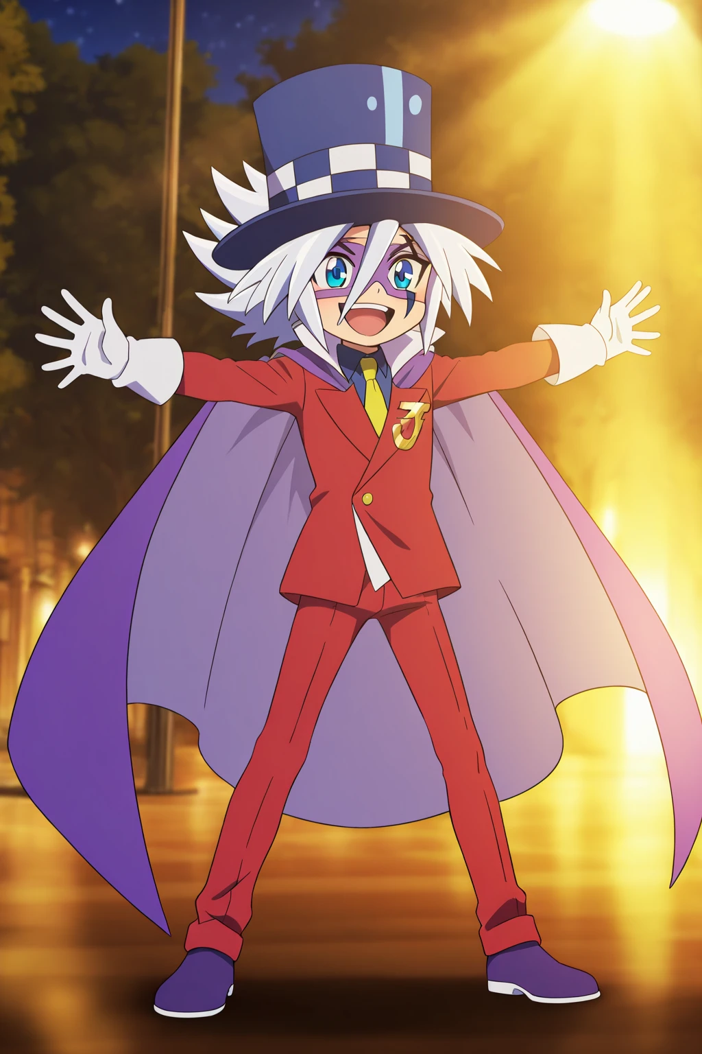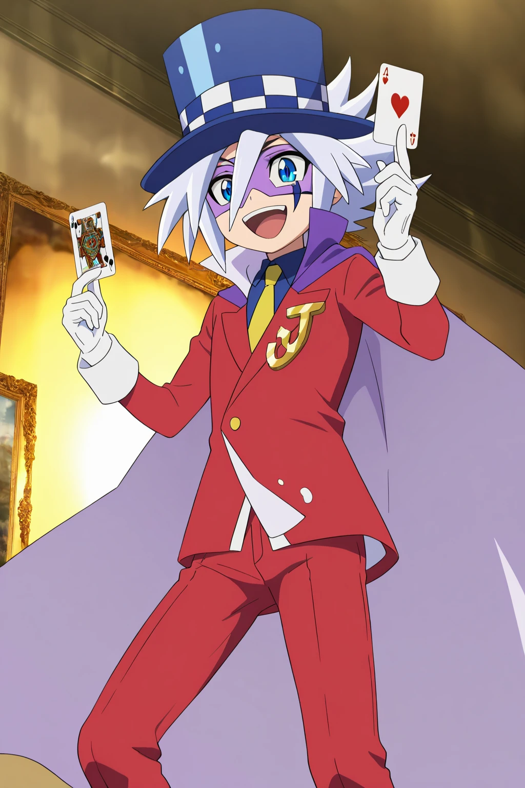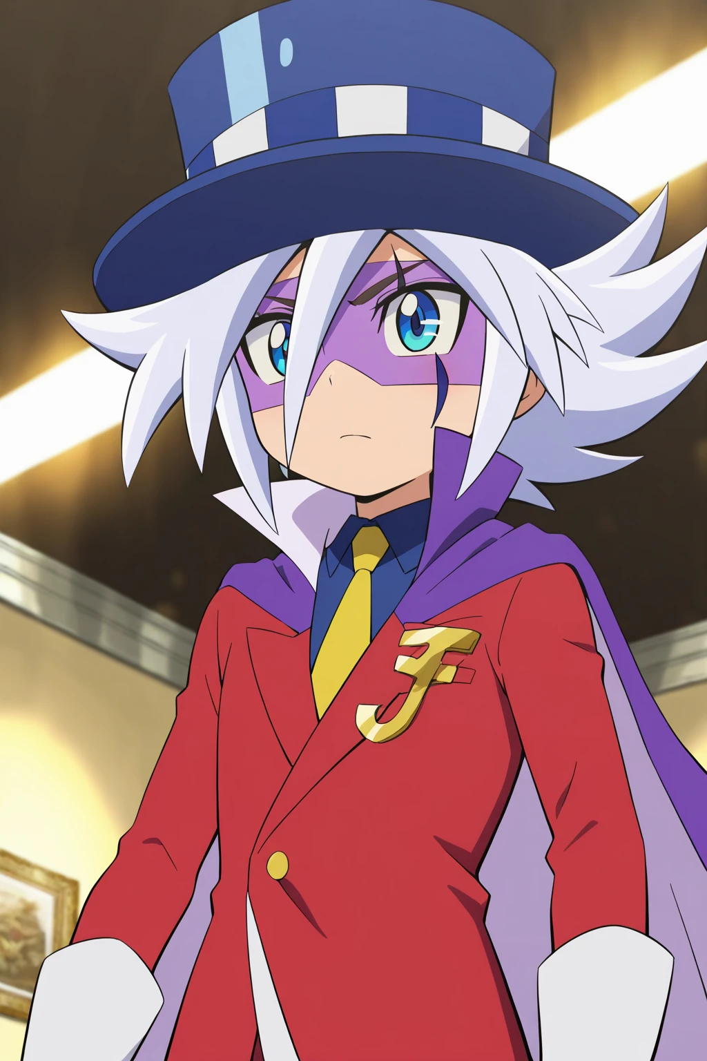 guaidao,blue hat, white hair, spike hair,(facial mark, domino mask:1.5), thin eyebrows,blue eyes,black eyebrows, yellow tie, blue underwear, red suit, red pants, white gloves, purple shoes, purple cape,Gold accessories on clothes,1boy,