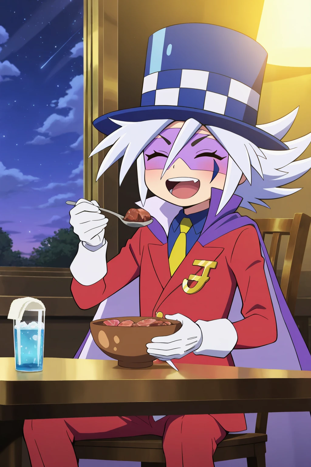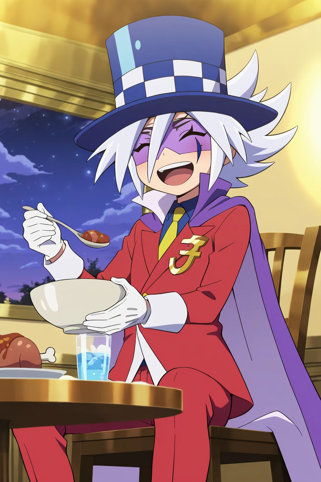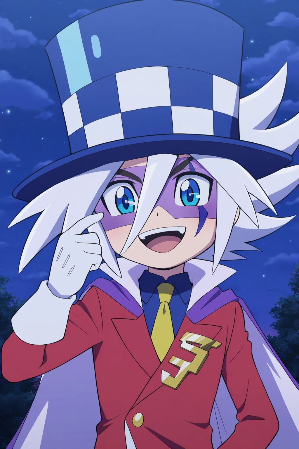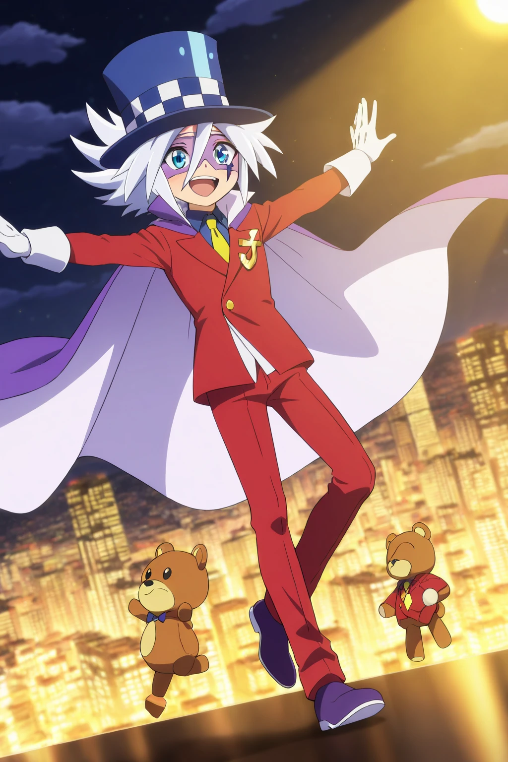 guaidao,blue hat, white hair, spike hair,(facial mark, domino mask:1.5), thin eyebrows,blue eyes,black eyebrows, yellow tie, blue underwear, red suit, red pants, white gloves, purple shoes, purple cape,Gold accessories on clothes,1boy,