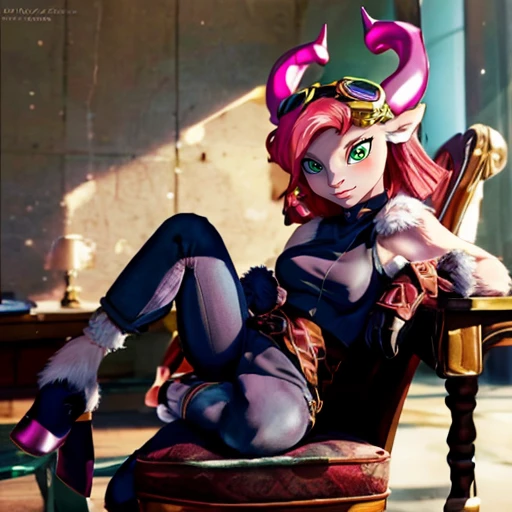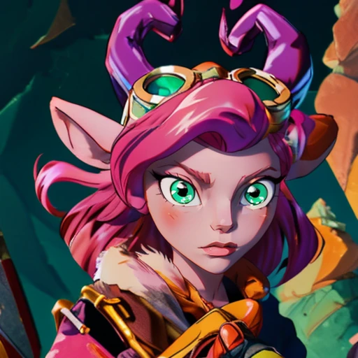 2. 1girl, Splat, pink hair, green eyes, goggles on head, furry female, fur body, colored fur, pink fur, animal ears, animal nose, goat tail, horns