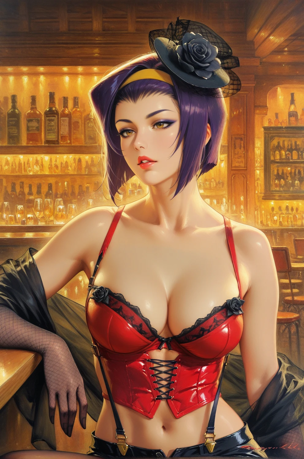 fishnet gloves, elbow gloves, black flower hat, veil, jewelry, earrings, dress, arabian clothes, cleavage, necklace, brown hair, bracelet, high heels, blonde hair, red lips, hair bun, choker, strapless, corset, bare shoulders, red dress, red lips, looking to the side, see-through