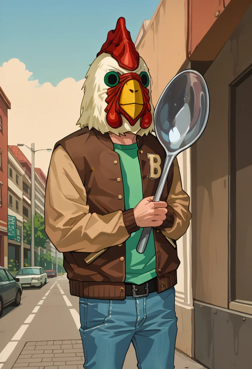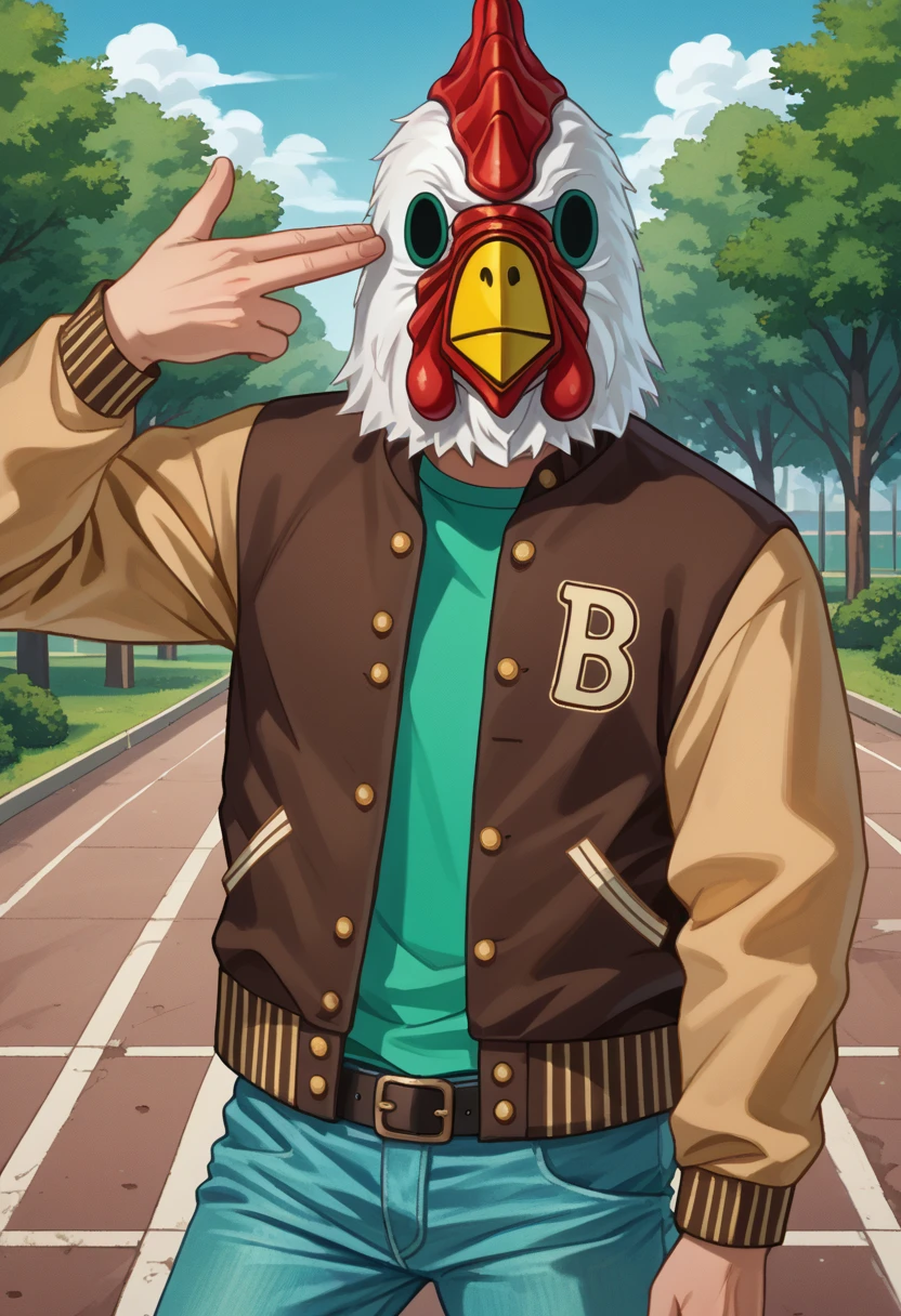 JacketHotlineMiami, mask, letterman jacket, brown jacket, green shirt, belt, jeans