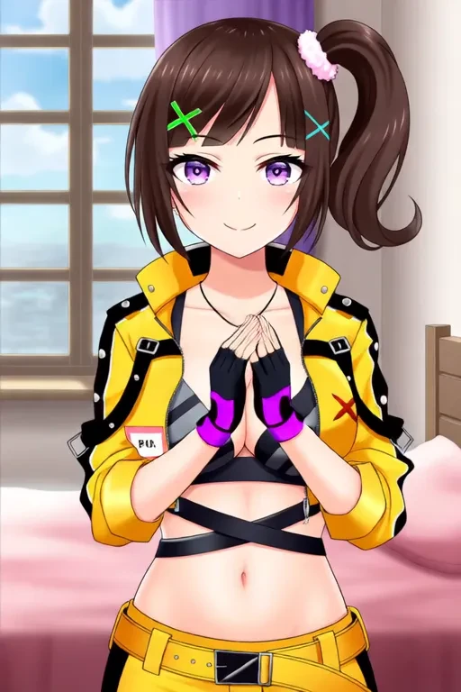 Hayase Sou, anime-style girl. The image features an anime-style character with long brown hair styled in a high ponytail. The hair is adorned with a X green barrette on the left side and a pink hair accessory on the right side. The character has purple eyes and is wearing a yellow jacket with black accents and a black bra top underneath. The jacket has multiple straps and buckles, giving it a tactical look. She also wears black gloves with purple accents and a necklace with a small pendant.The character's pants are yellow with black accents, including a black belt and a black patch