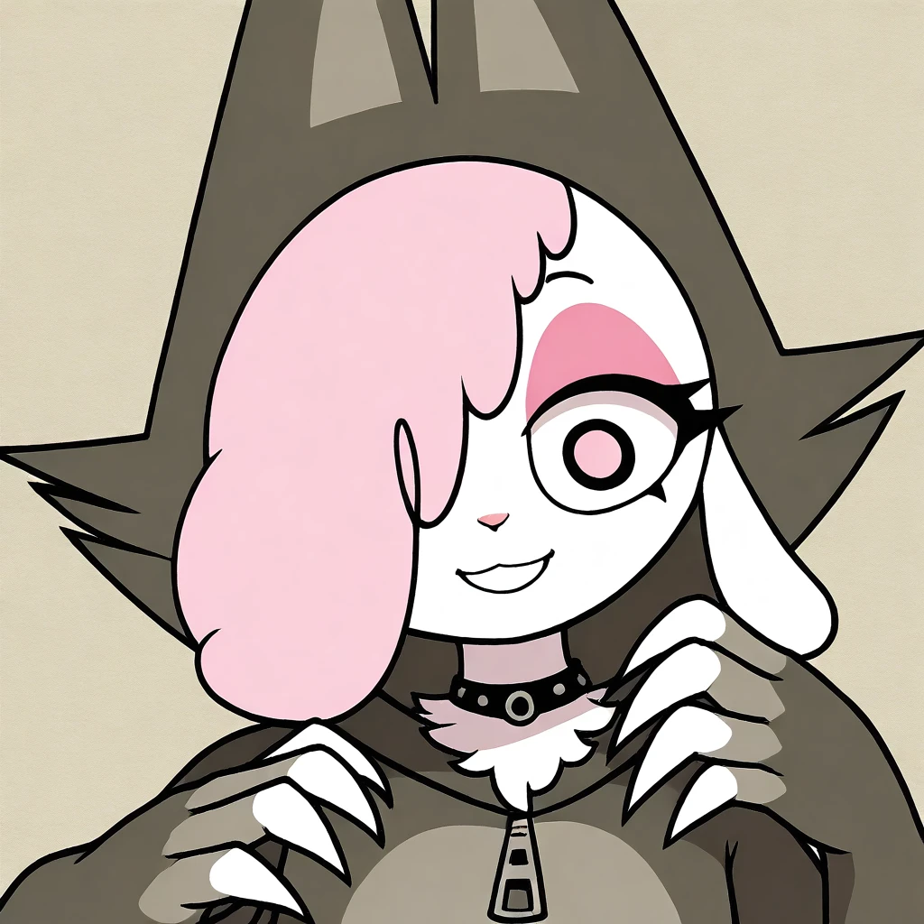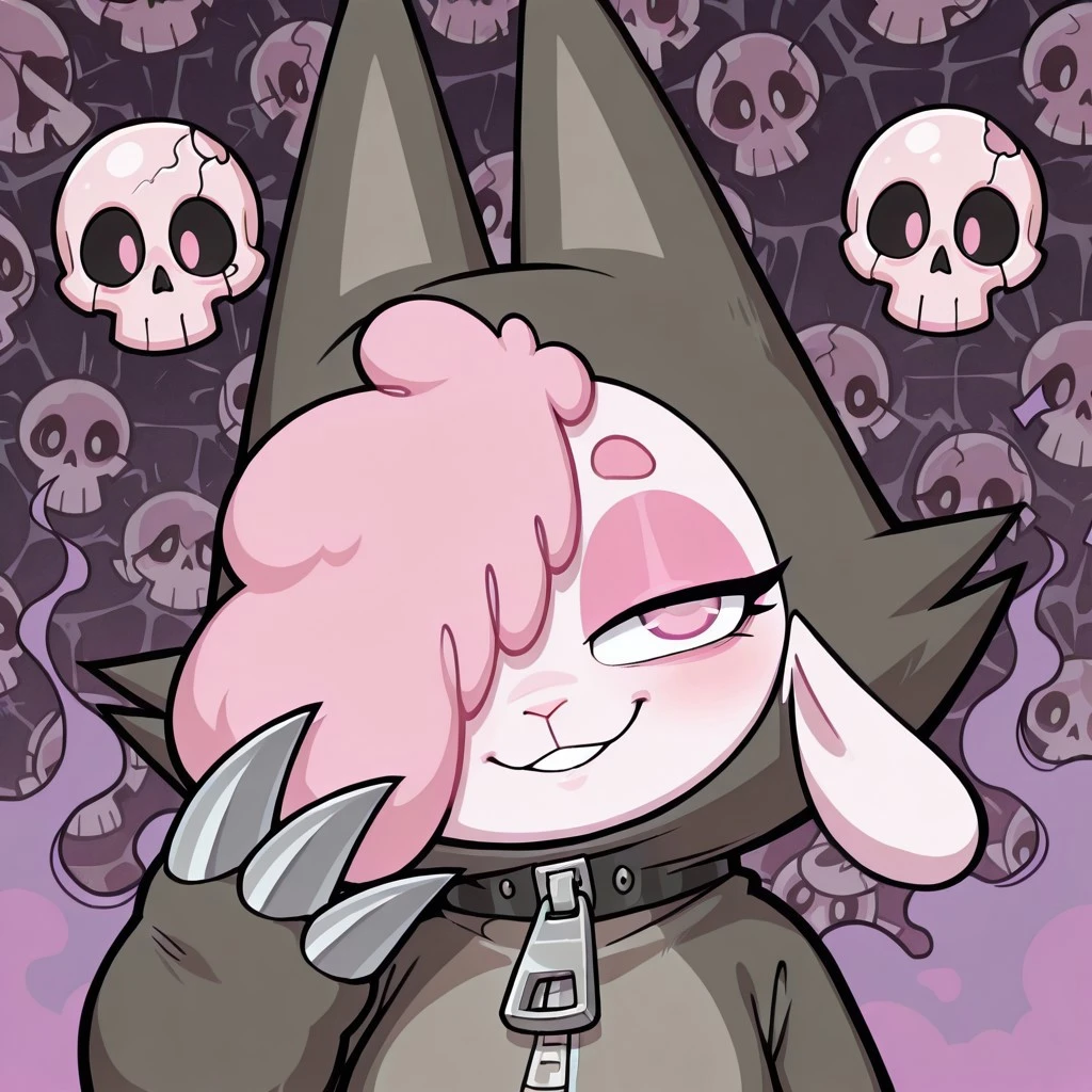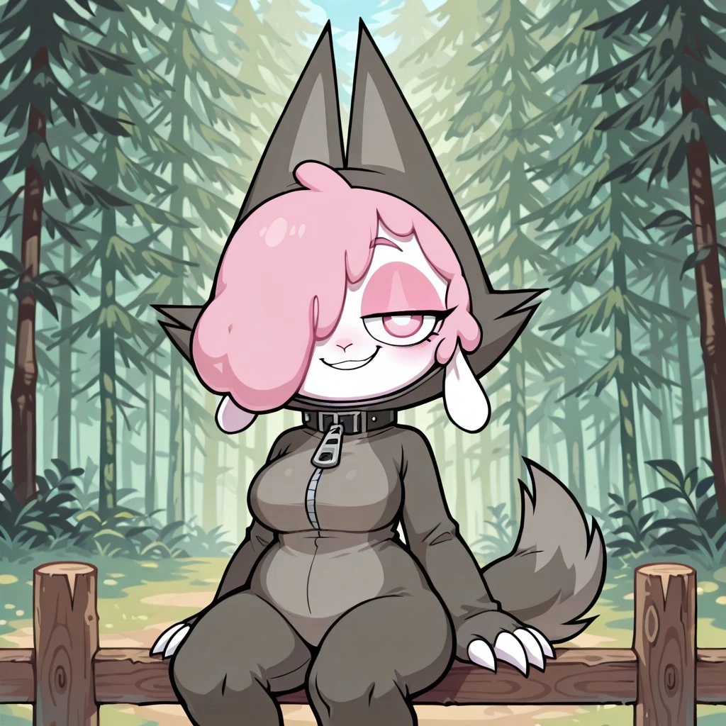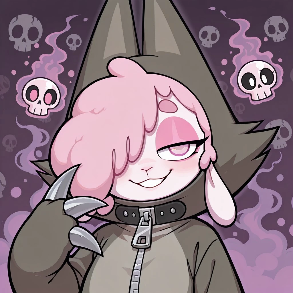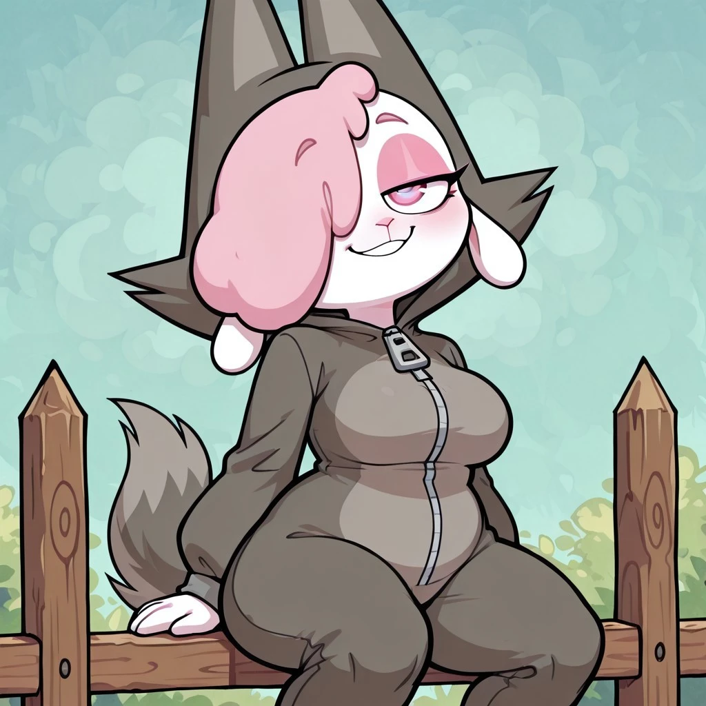 sheep female, solo, white fur, pink wool over one eye, black eye with pink pupil, pink eyeshadow, droopy sheep ears, dark gray wolf costume with gray accents, wolf tail, large zipper, wolf costume with pointed ears, white claws,