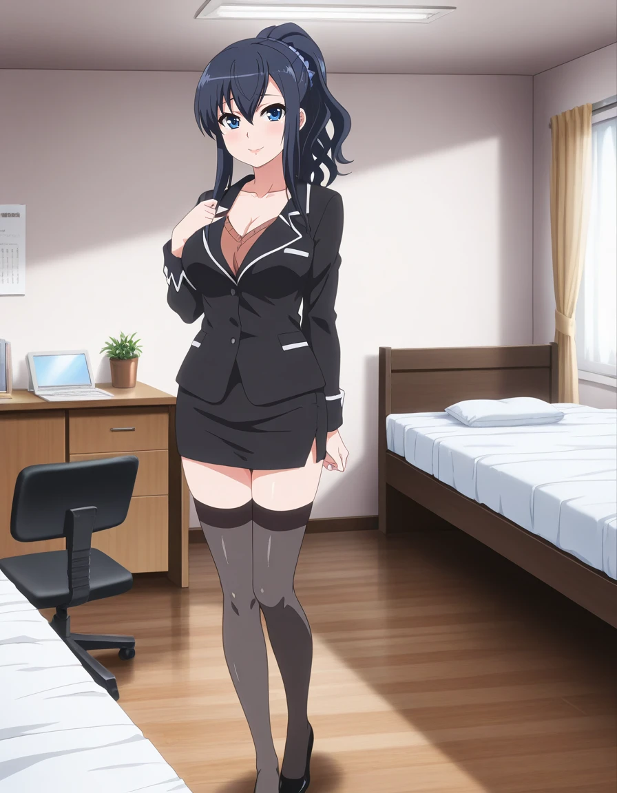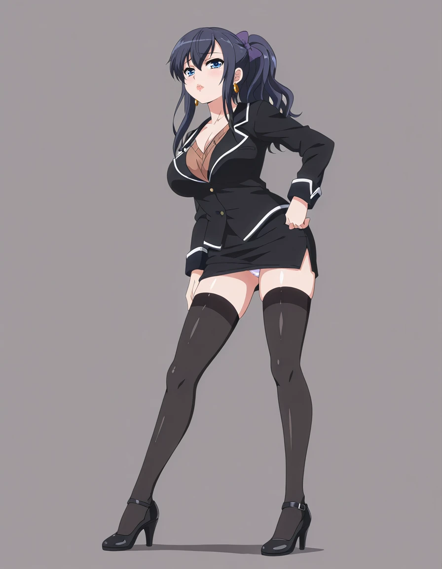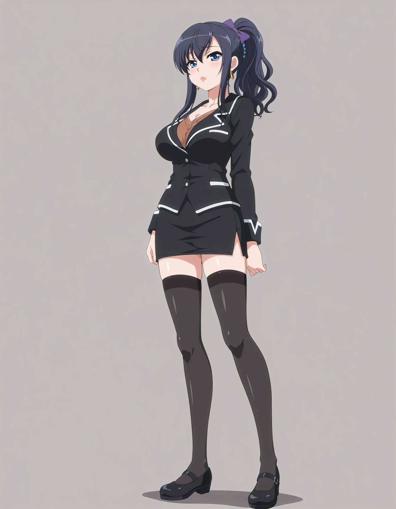 mai_renaik,long_hair,ponytail,black_hair,blue_eyes,large_breasts,lips,purple_hair_bow,earrings,teaher,black_jacket,black_pencil_skirt,black_thighhighs,black_mary_janes