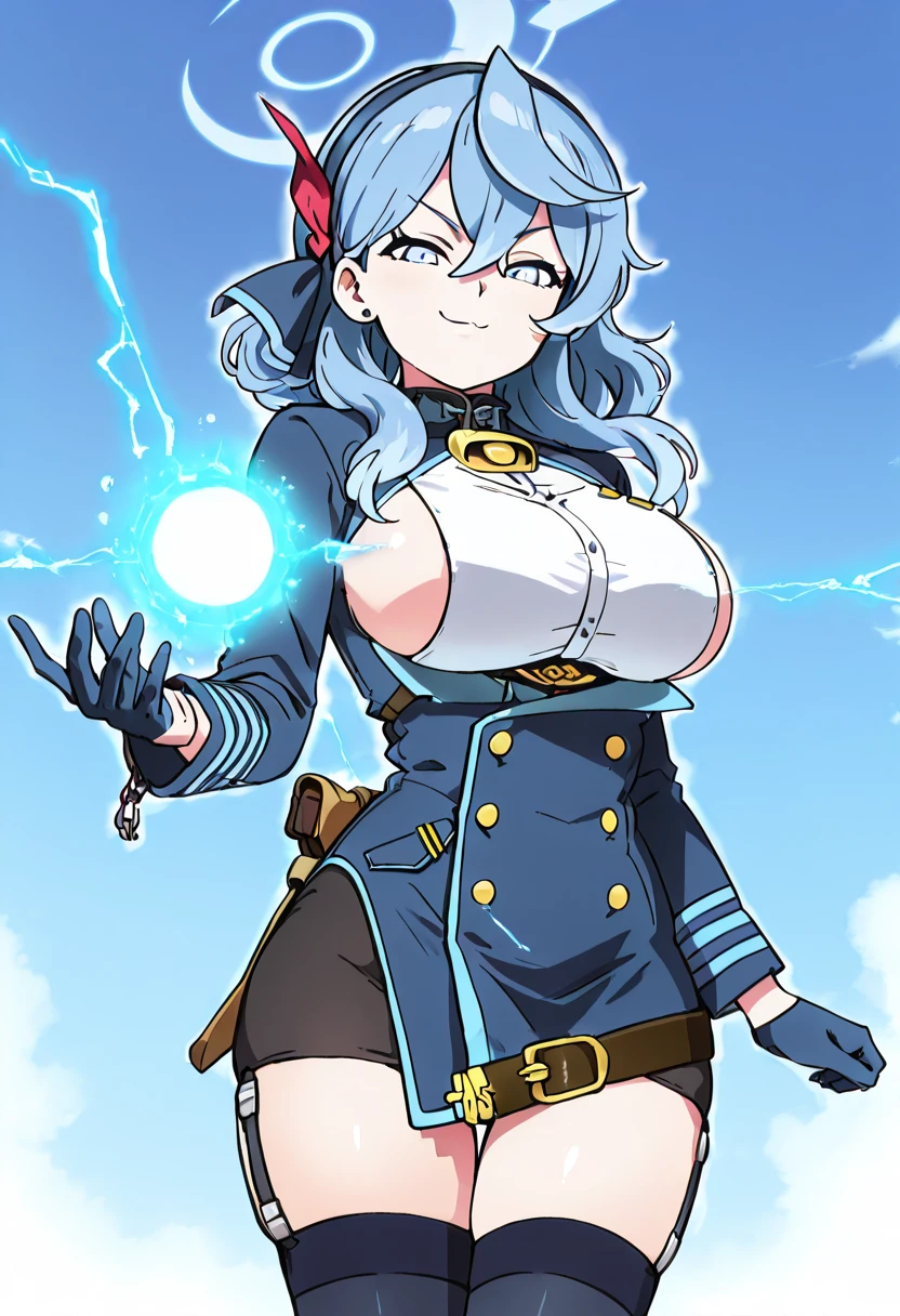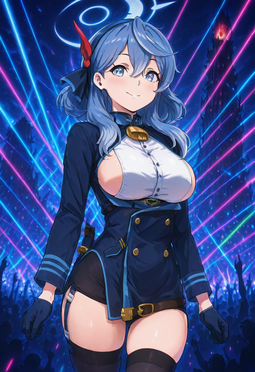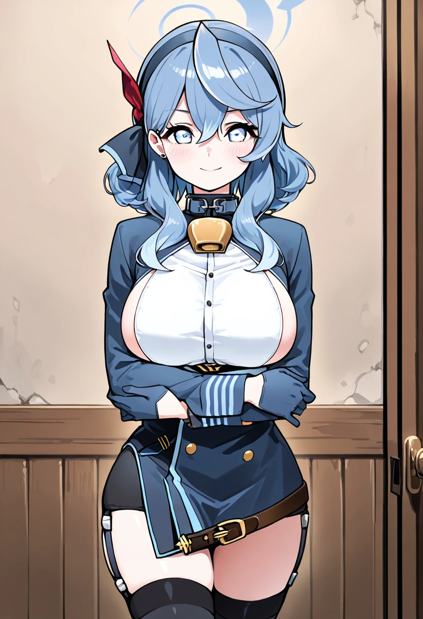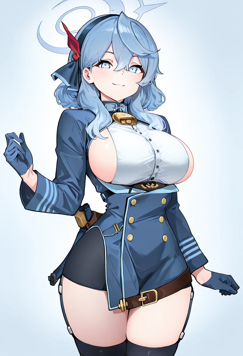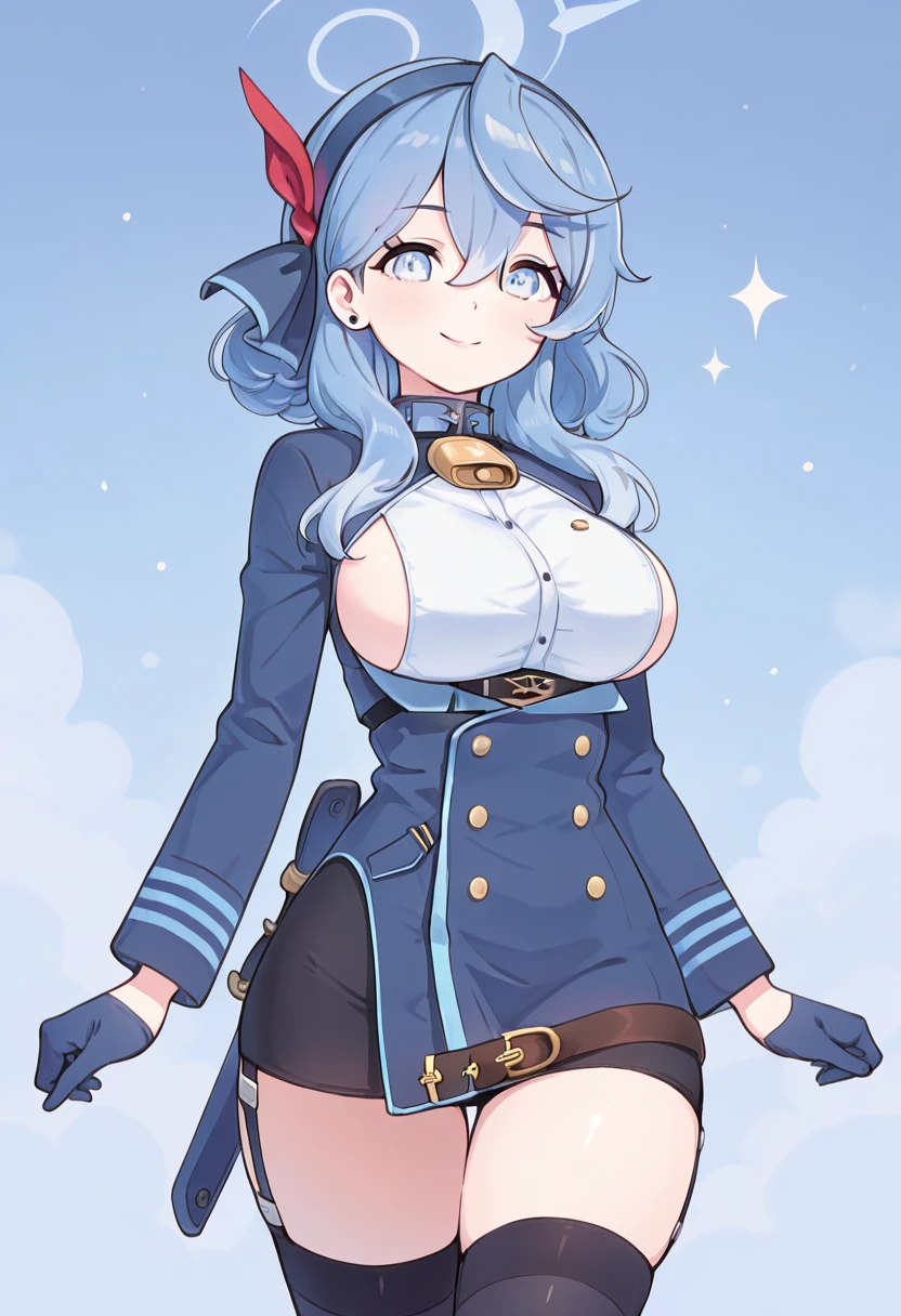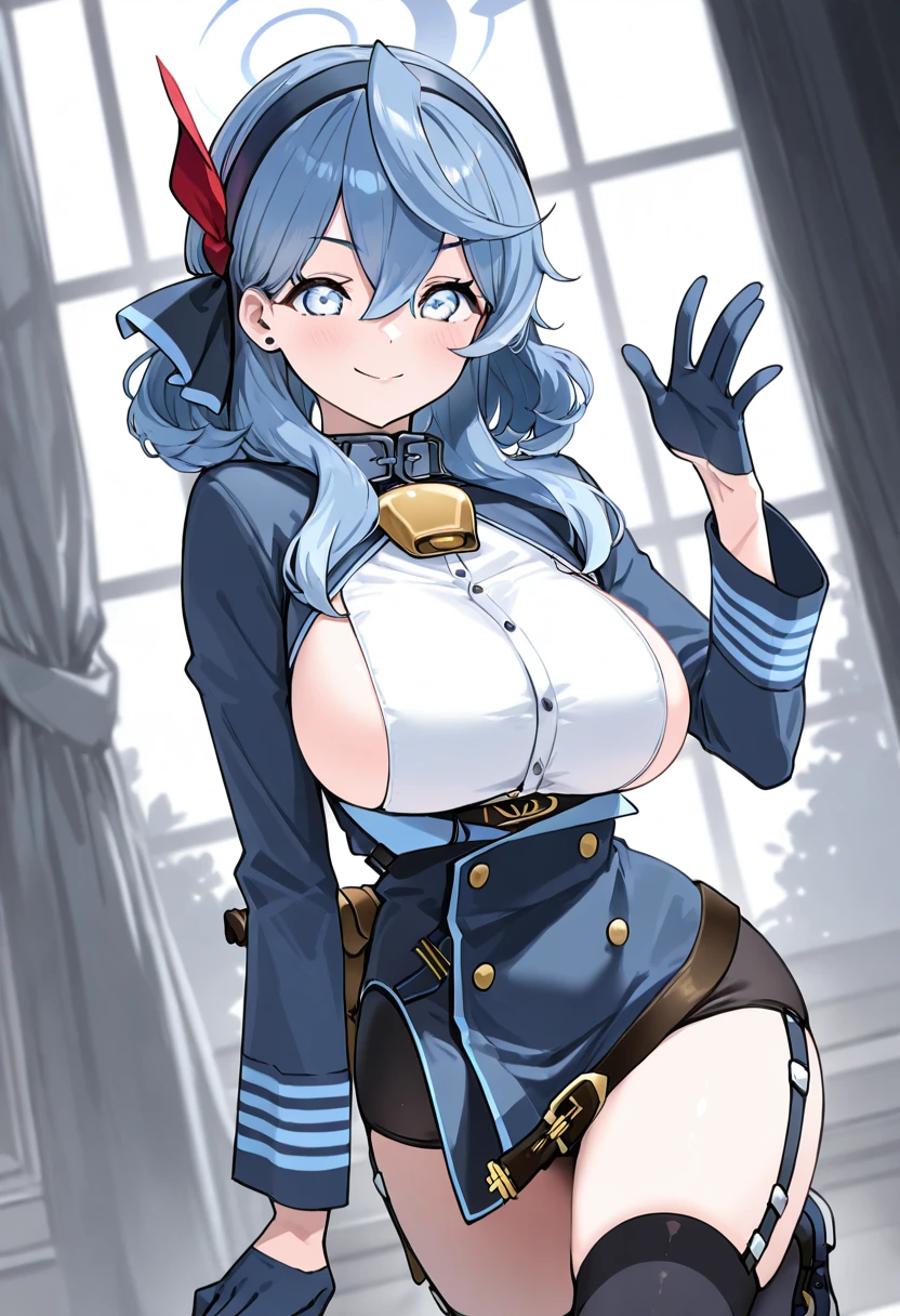 zzAko, blue eyes, hair between eyes, black hairband, blue hair, blue hairband, hair ribbon, medium hair, white shirt, blue jacket, black gloves, blue gloves, garter straps, black thighhighs,