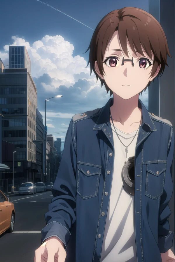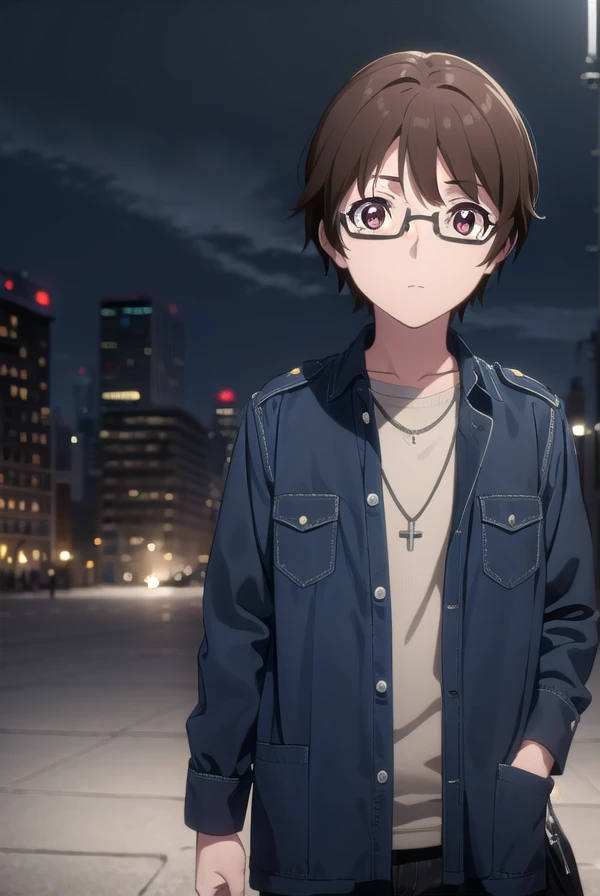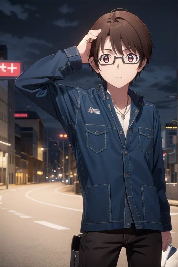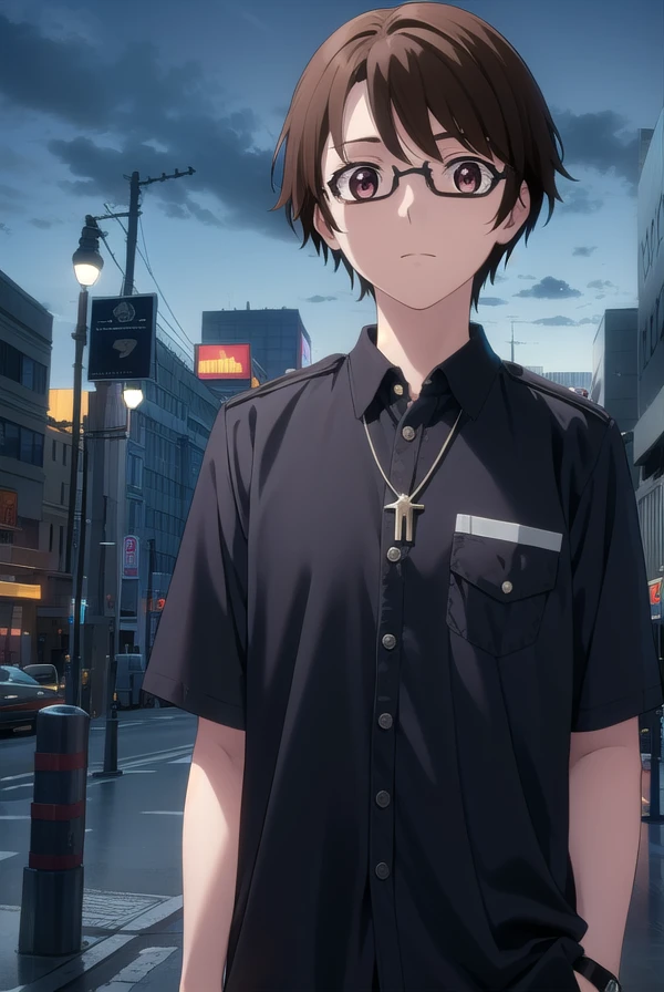 souta mizushino, brown hair, (brown eyes:1.3), male focus, glasses,