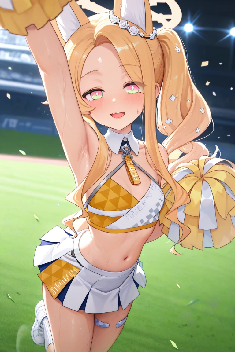 Seia_Cheerleader,blonde hair, long hair, side ponytail, sidelocks, pink eyes, halo,fox girl, extra ears, fox ears, animal ear fluff, fox tail,cheerleader, yellow crop top, miniskirt, pleated skirt, yellow skirt, white skirt,sneakers, white footwear,Optional: