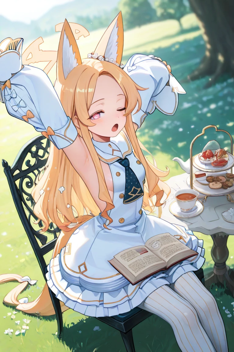 Seia_Base,blonde hair, long hair, parted bangs, sidelocks, pink eyes, halo,fox girl, extra ears, fox ears, animal ear fluff, fox tail,white dress, frilled dress, sleeveless dress, long sleeves, detached sleeves, sleeves past fingers, puffy long sleeves,sailor collar, short necktie,white pantyhose, striped pantyhose,white footwear, high heels,hair ornament, hair flower,Swimsuit: