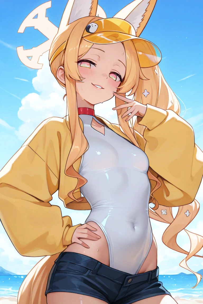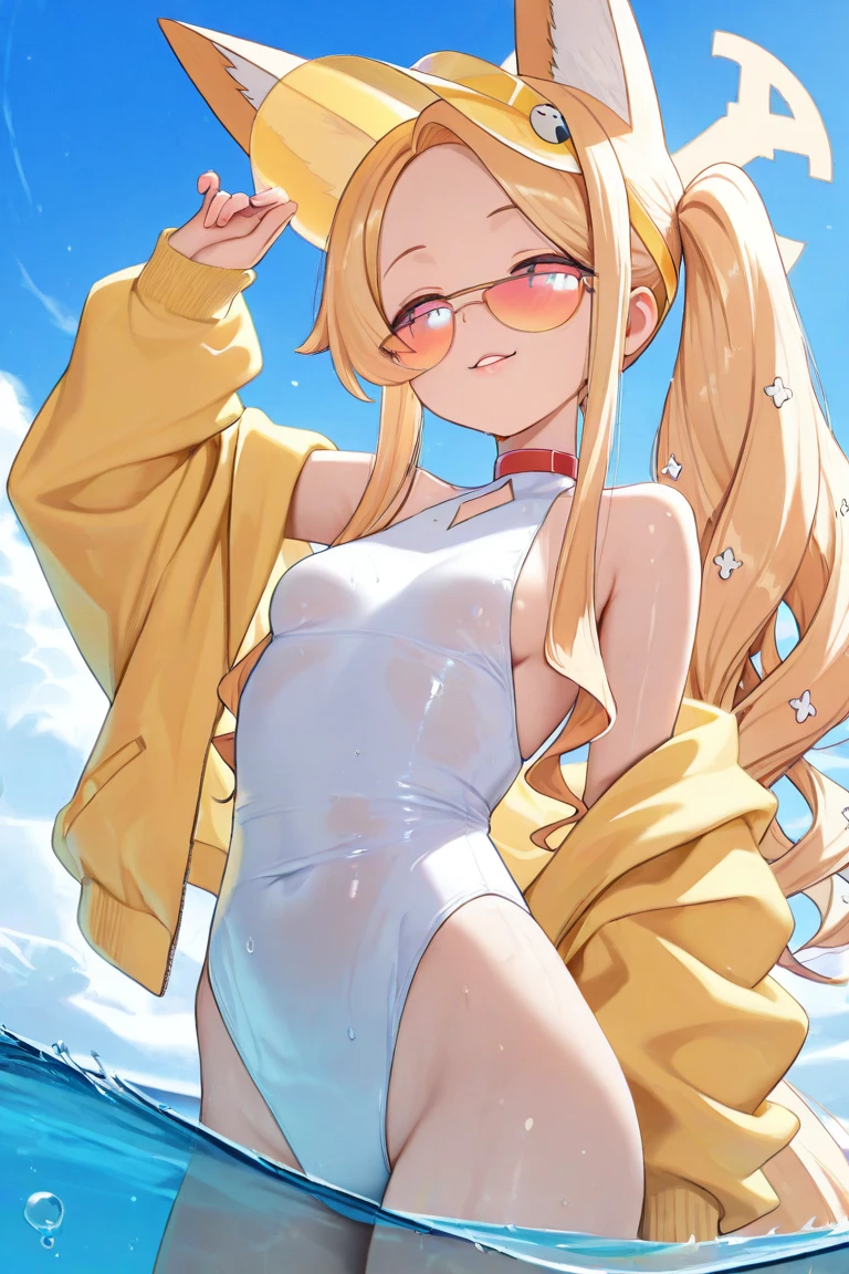 Seia_Swimsuit,blonde hair, long hair, side ponytail, sidelocks, pink eyes, halo,fox girl, extra ears, fox ears, animal ear fluff, fox tail,yellow jacket, open jacket, long sleeves, sleeves past wrists,white one-piece swimsuit, highleg one-piece swimsuit, diamond cutout,yellow footwear, sandals,yellow headwear, visor,tinted eyewear, sunglasses,Optional: