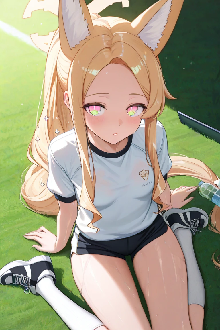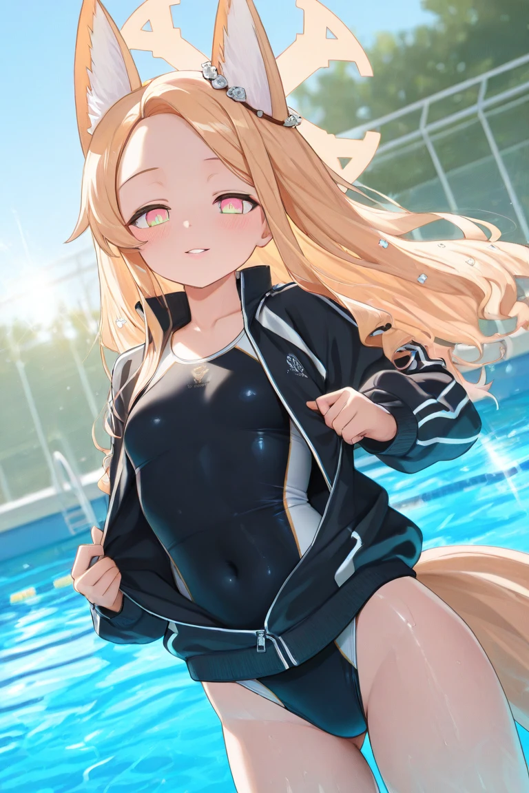 Seia_Sports,blonde hair, long hair, parted bangs, ponytail, sidelocks, pink eyes, halo,fox girl, extra ears, fox ears, animal ear fluff, fox tail,gym uniform, track jacket, black jacket, long sleeves, open jacket,white shirt, short sleeves,blue shorts,black footwear, sneakers,Trinity Swimsuit: