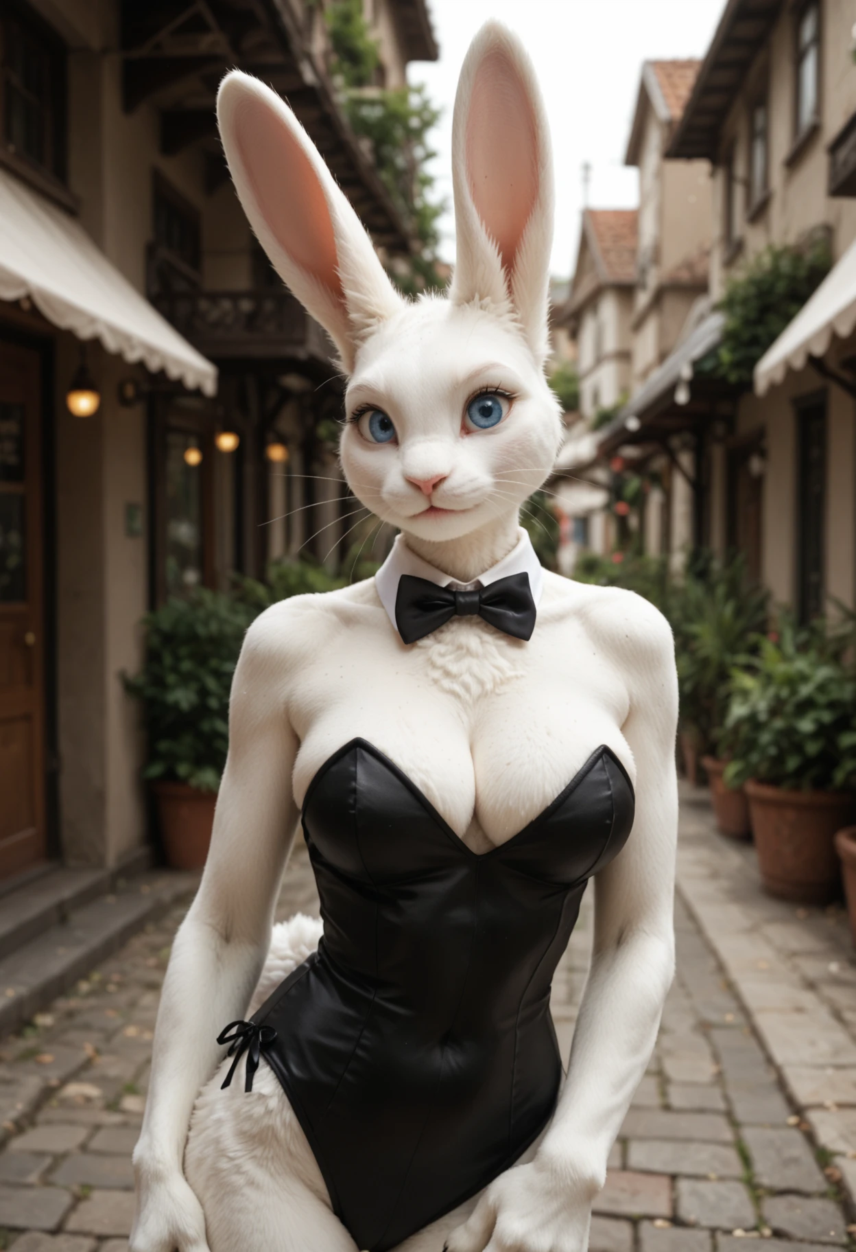 score_9, score_8_up, score_7_up, 1girl, solo, furry, anthropomorphic rabbit, bunny, white fur, blue eyes, slim build, large breasts, female bp black outfit, bow tie, bunny tail, smileSnek