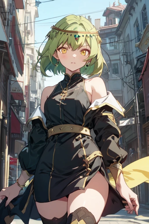 ZofiaHonkai, 1girl, solo, short hair, thighhighs, black dress, bare shoulders, jewelry, yellow eyes, green hair, circlet, shirt, long sleeves,