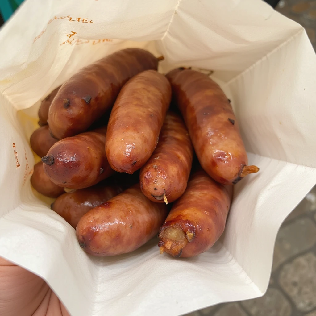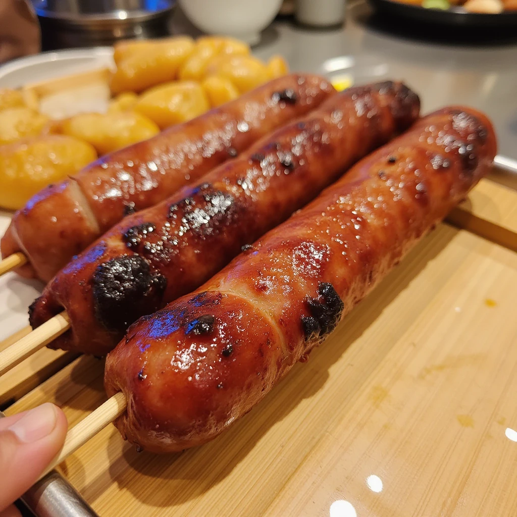 Taiwanese Grilled Sausage English Introduction: Taiwanese grilled sausages, known locally as kǎo xiāng cháng (烤香腸), are a beloved street food in Taiwan. These sausages are typically made from coarsely ground pork, mixed with garlic and other seasonings, giving them a slightly sweet and savory flavor. They are grilled over an open flame until the outside is slightly charred and crispy, while the inside remains juicy. Often served on a skewer, they can be enjoyed on their own or with various condiments like raw garlic cloves or sweet chili sauce. Taiwanese grilled sausages are a staple at night markets and street stalls, offering a tasty and satisfying snack for locals and tourists alike.