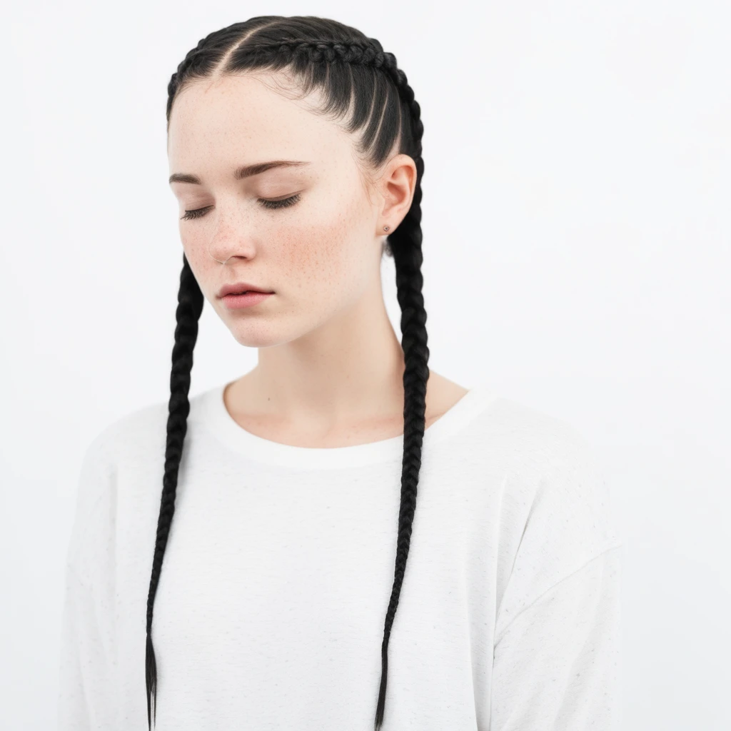 Boxer braids are a chic and sporty hairstyle characterized by two tightly woven Dutch braids running from the front hairline down to the nape of the neck, one on each side of the head.