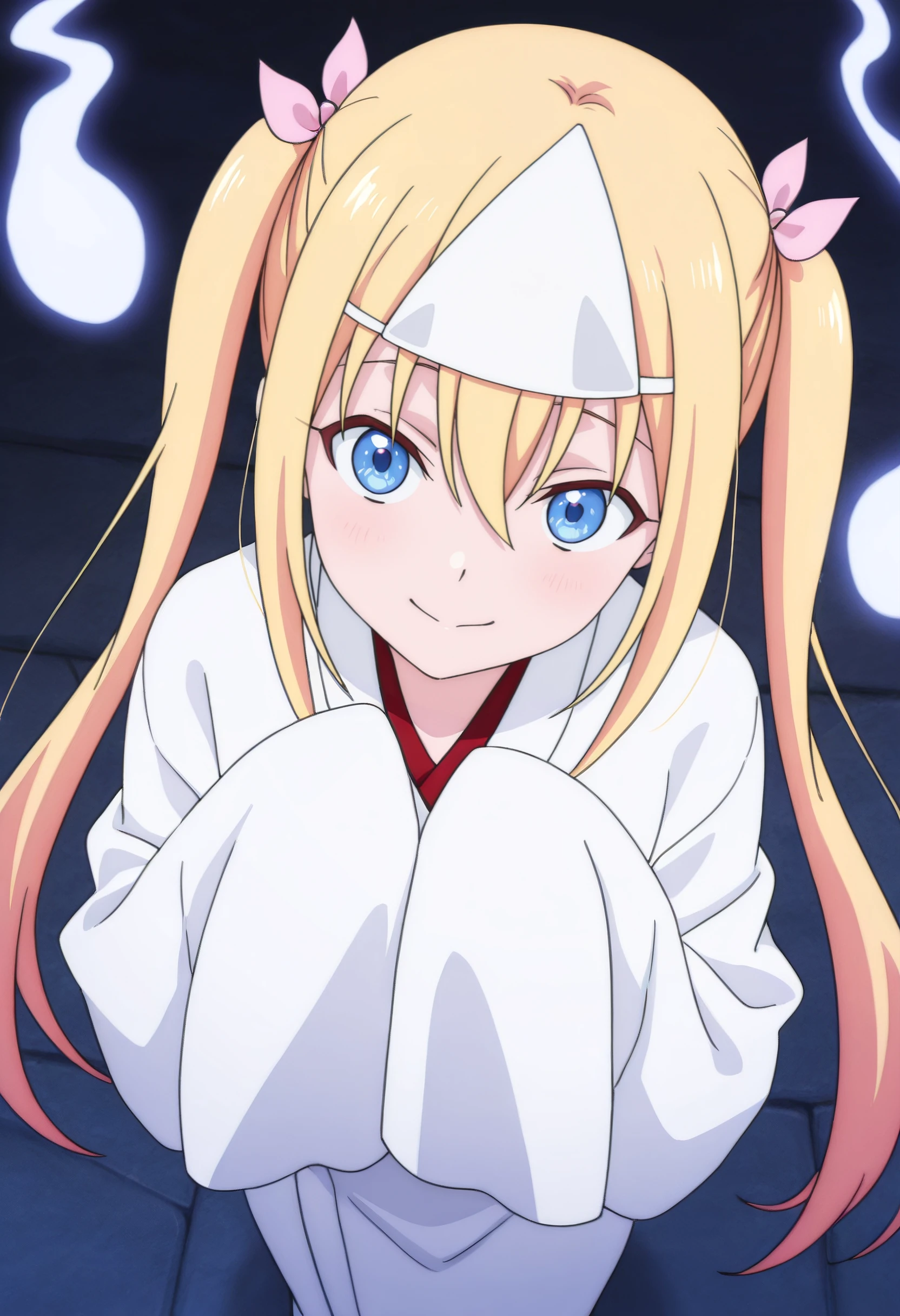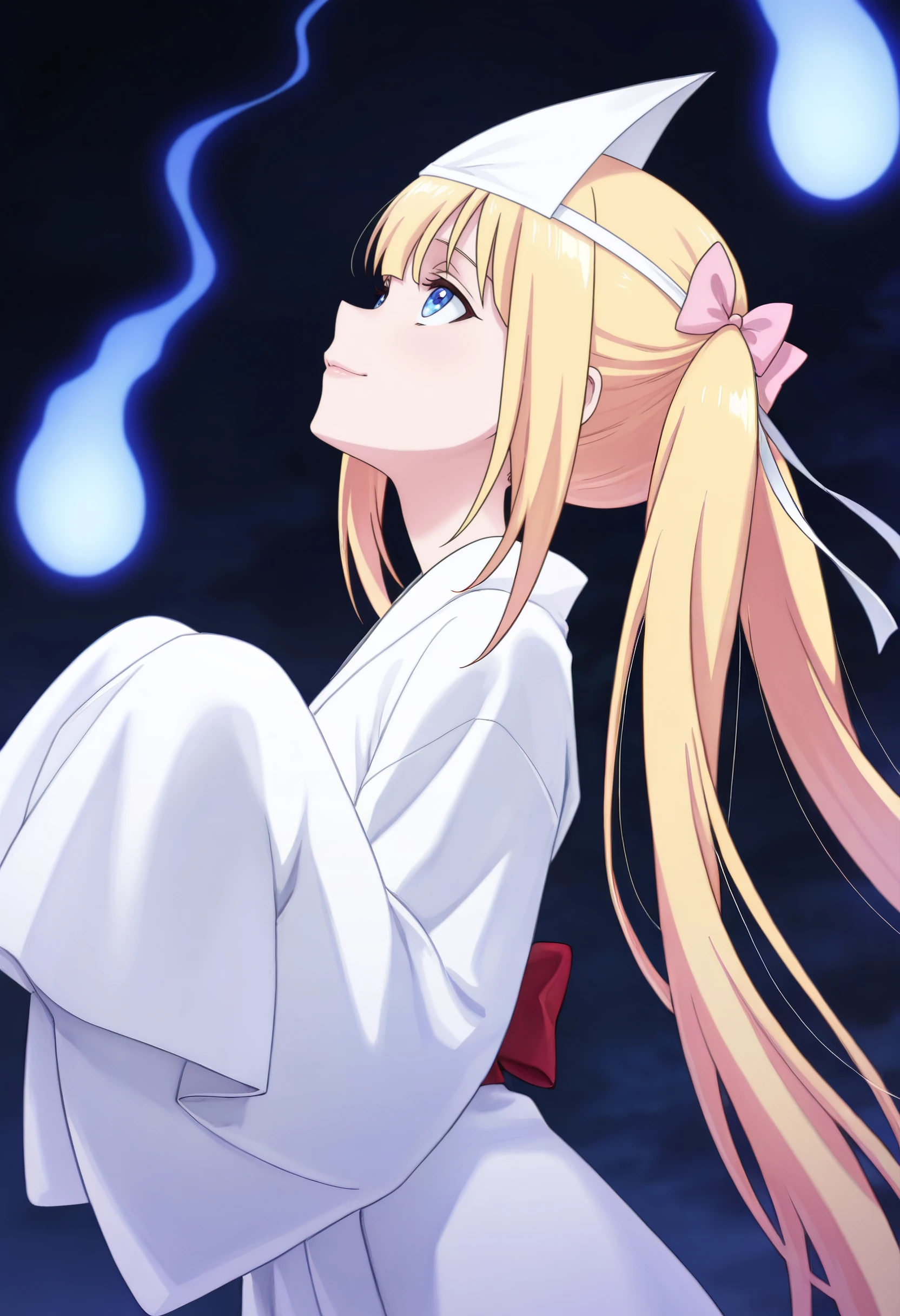 ClarisHalloween, japanese clothes, triangular headpiece, right-over-left kimono, kimono, white kimono, ghost, sleeves past wrists, sleeves past fingers, long sleeves, ghost costume, bow, wide sleeves, hair bow, hair ornament, hitodama, white robe, hair ribbon,