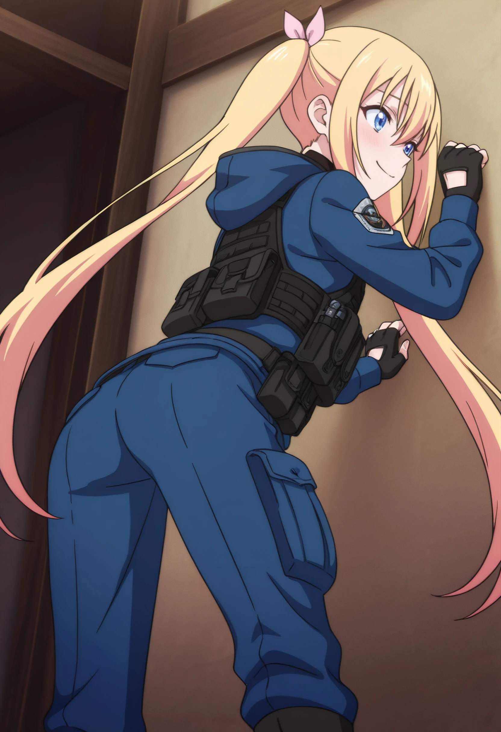 ClarisJacket, jacket, hair between eyes, long sleeves, gloves, hood, black gloves, hair ribbon, fingerless gloves, blue jacket, belt, pink ribbon, coat, pants, military uniform, military, tactical clothes, pouch, sidelocks, hooded jacket, blue pants, hair bow, bow, turtleneck, hair ornament, boots, ammunition pouch, bulletproof vest, snap-fit buckle, hood down, strap, black undershirt,