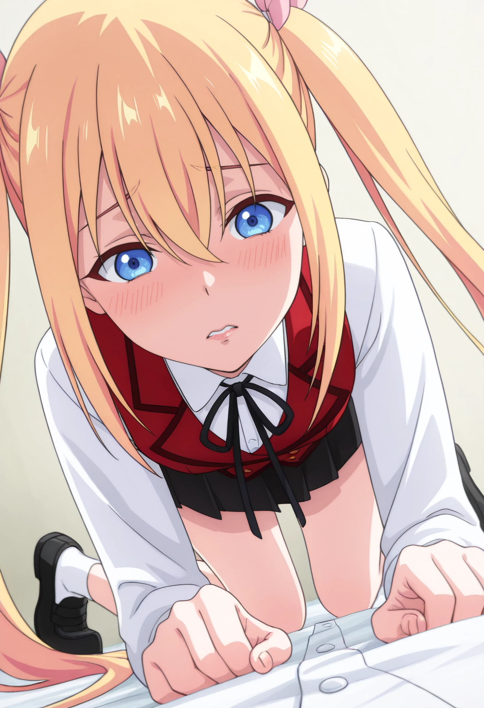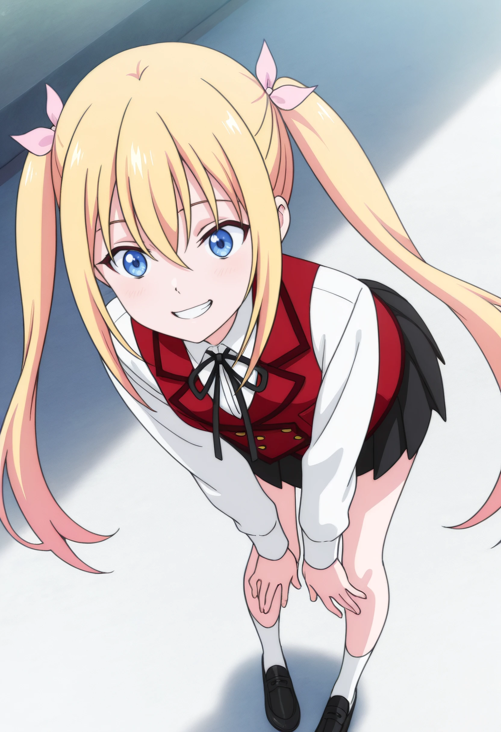 ClarisSchoolA, school uniform, shirt, vest, white shirt, hair ribbon, neck ribbon, black ribbon, collared shirt, long sleeves, hair between eyes, bow, red vest, hair ornament, pink ribbon, skirt, black skirt, pleated skirt, hair bow, dress shirt, miniskirt, buttons, socks, white socks, black footwear, shoes,