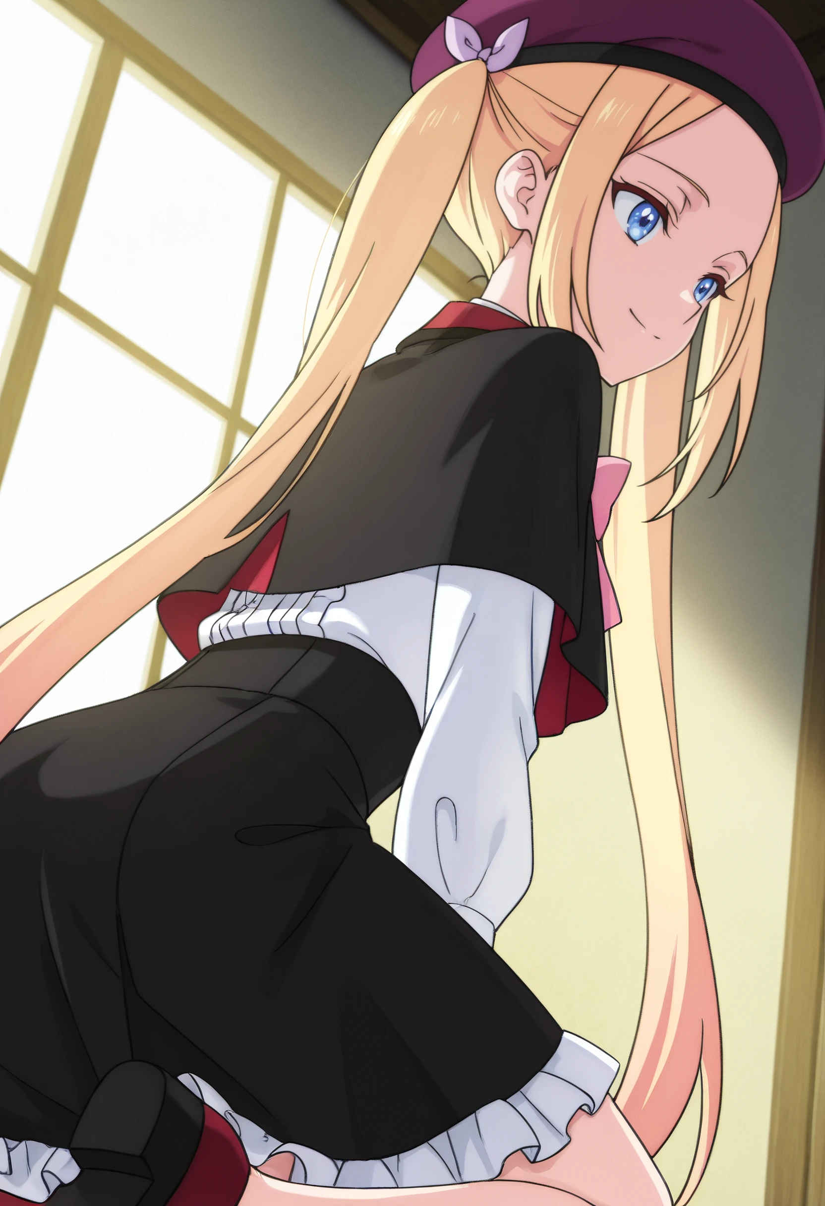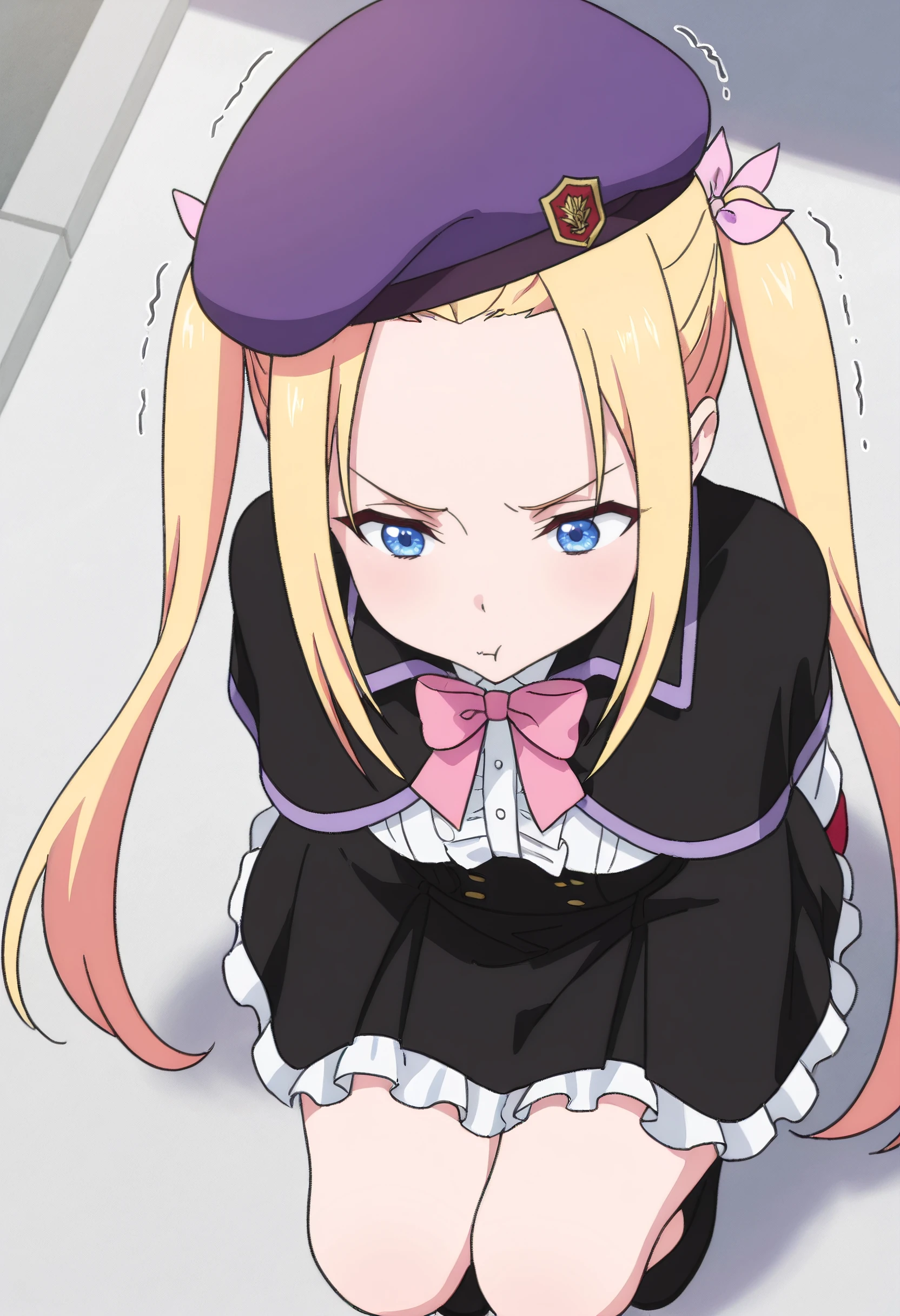 ClarisBeret, hat, capelet, bow, beret, black capelet, purple hat, pink bow, purple bow, shirt, forehead, frills, bowtie, pink bowtie, skirt, sidelocks, black skirt, frilled skirt, center frills, purple headwear,