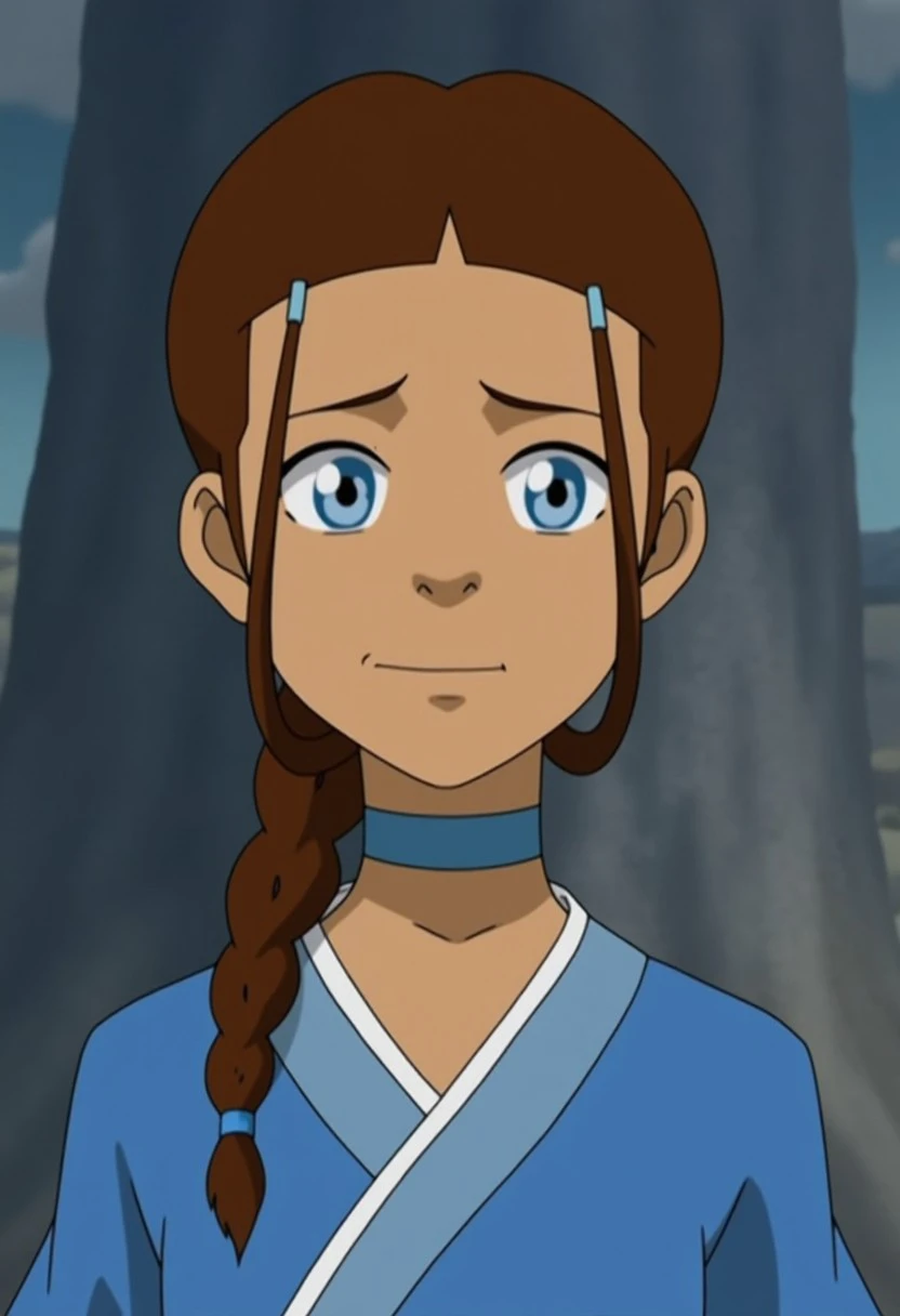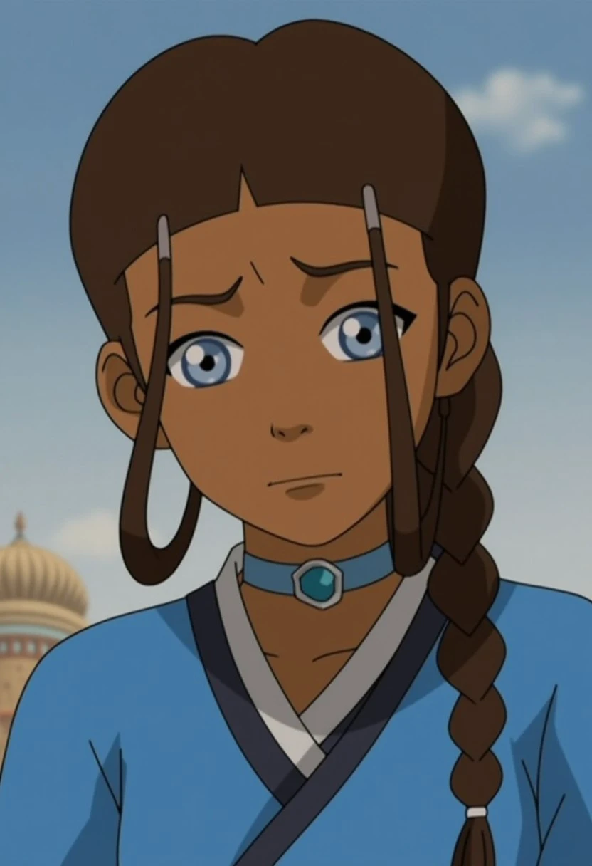 Katara, a woman with light brown skin, blue eyes, and brown hair, and a single braid. She is dressed in a traditional blue robe with a white sash tied around the waist.