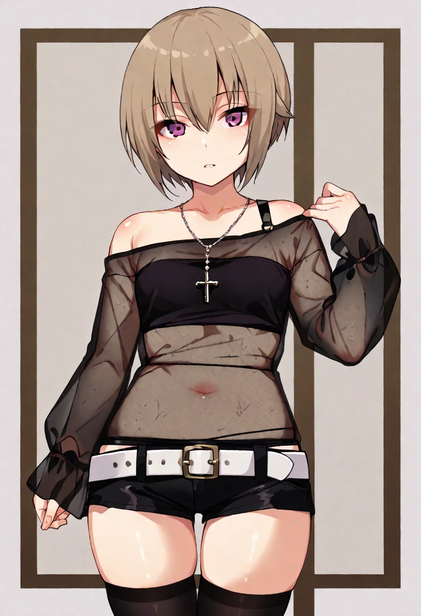 cross necklace,tube top,see through fishnet shirt,long sleeves,single strap,black shorts,white belt,black thighhighs