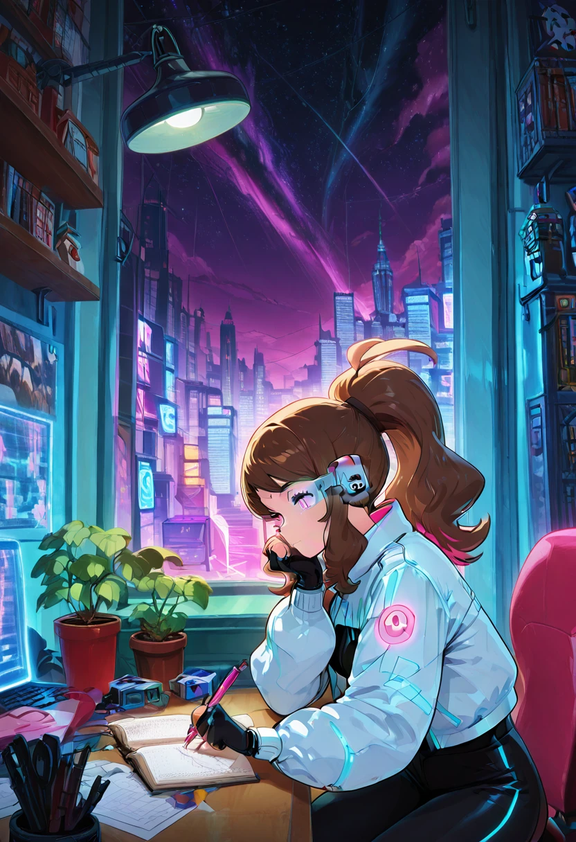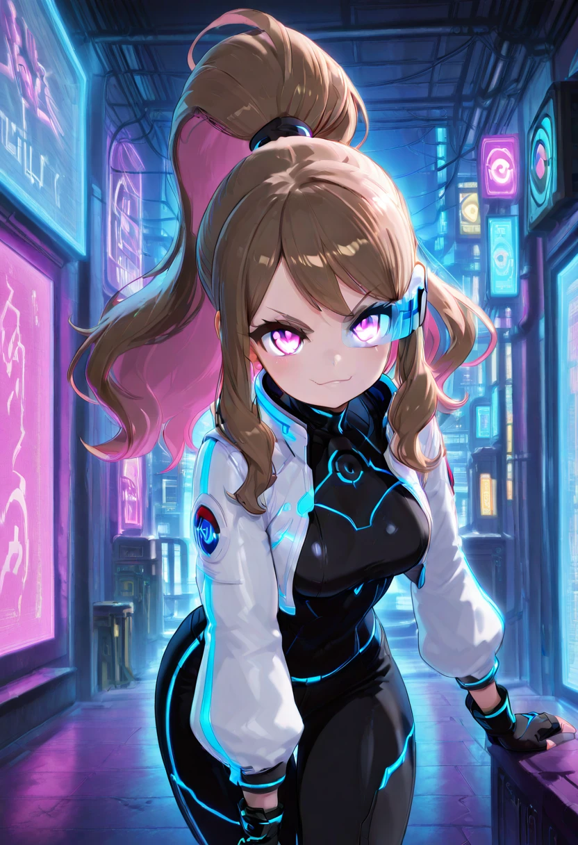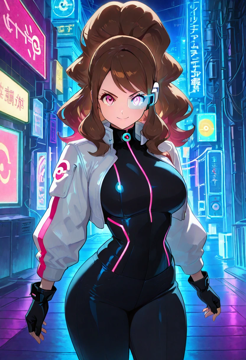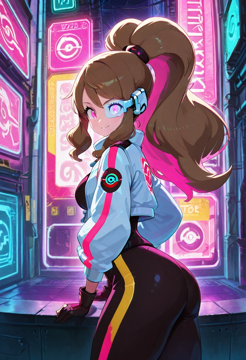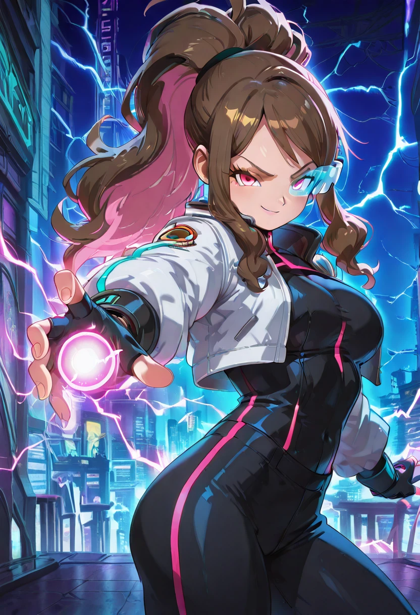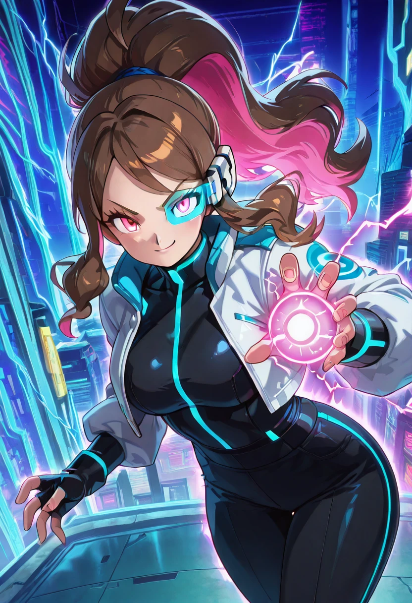 zzHildaLuxCitron, pink eyes, brown hair, high ponytail, long hair, multicolored hair, pink hair, ponytail, sidelocks, white jacket, long sleeves, shiny, pants, black gloves, cyberpunk, scouter,