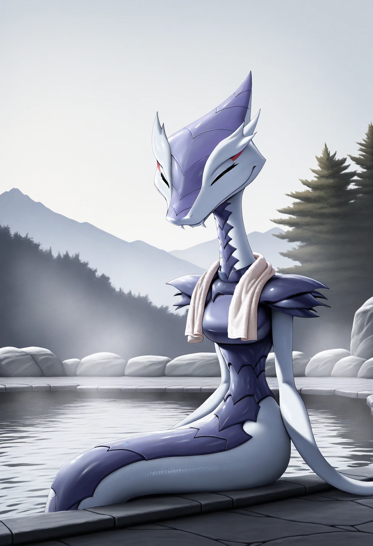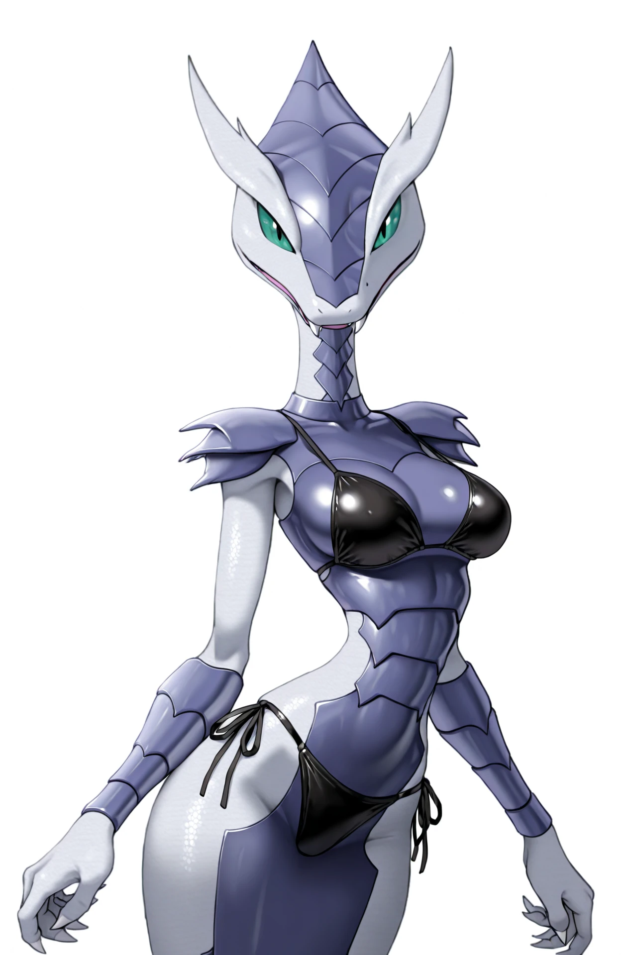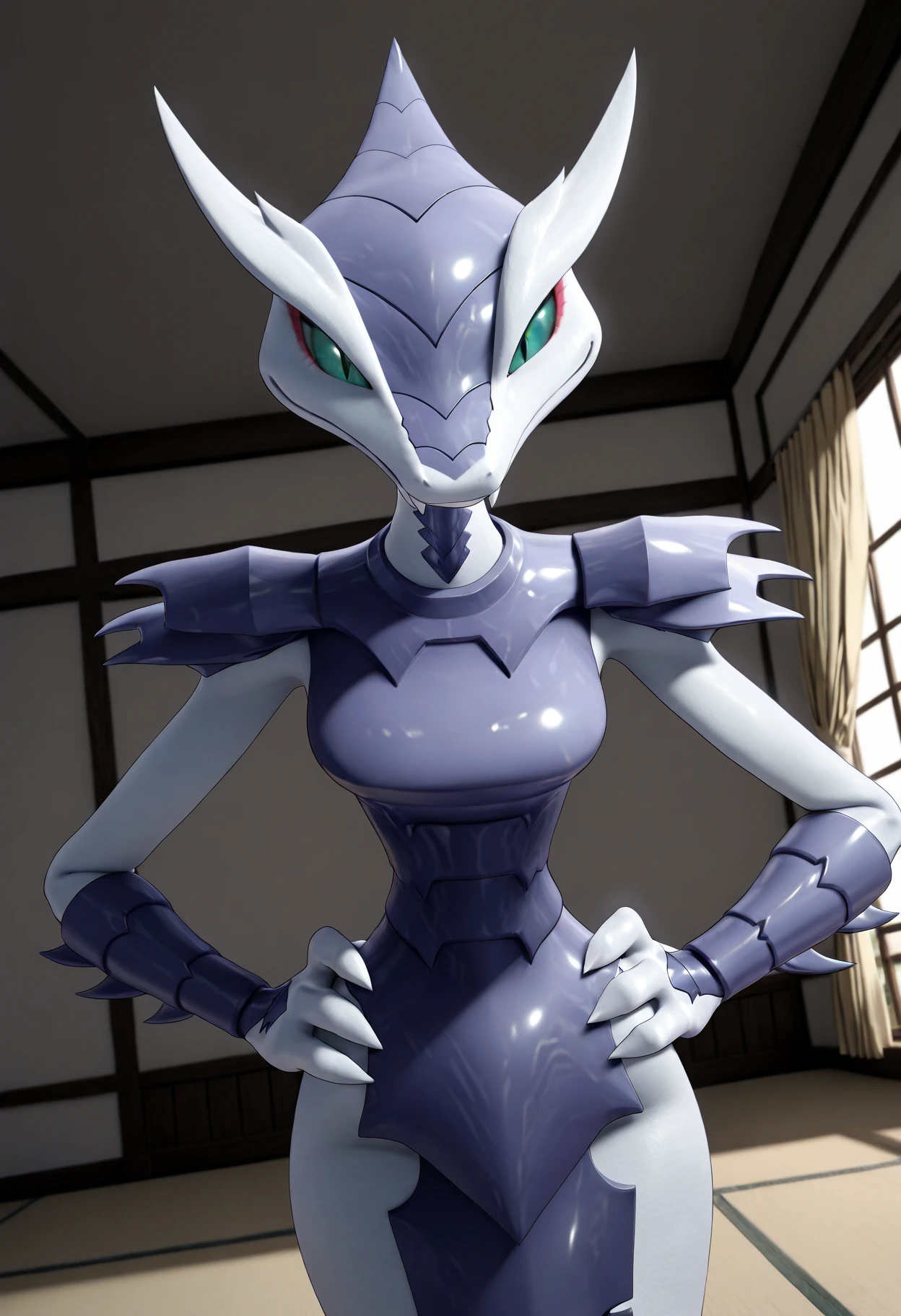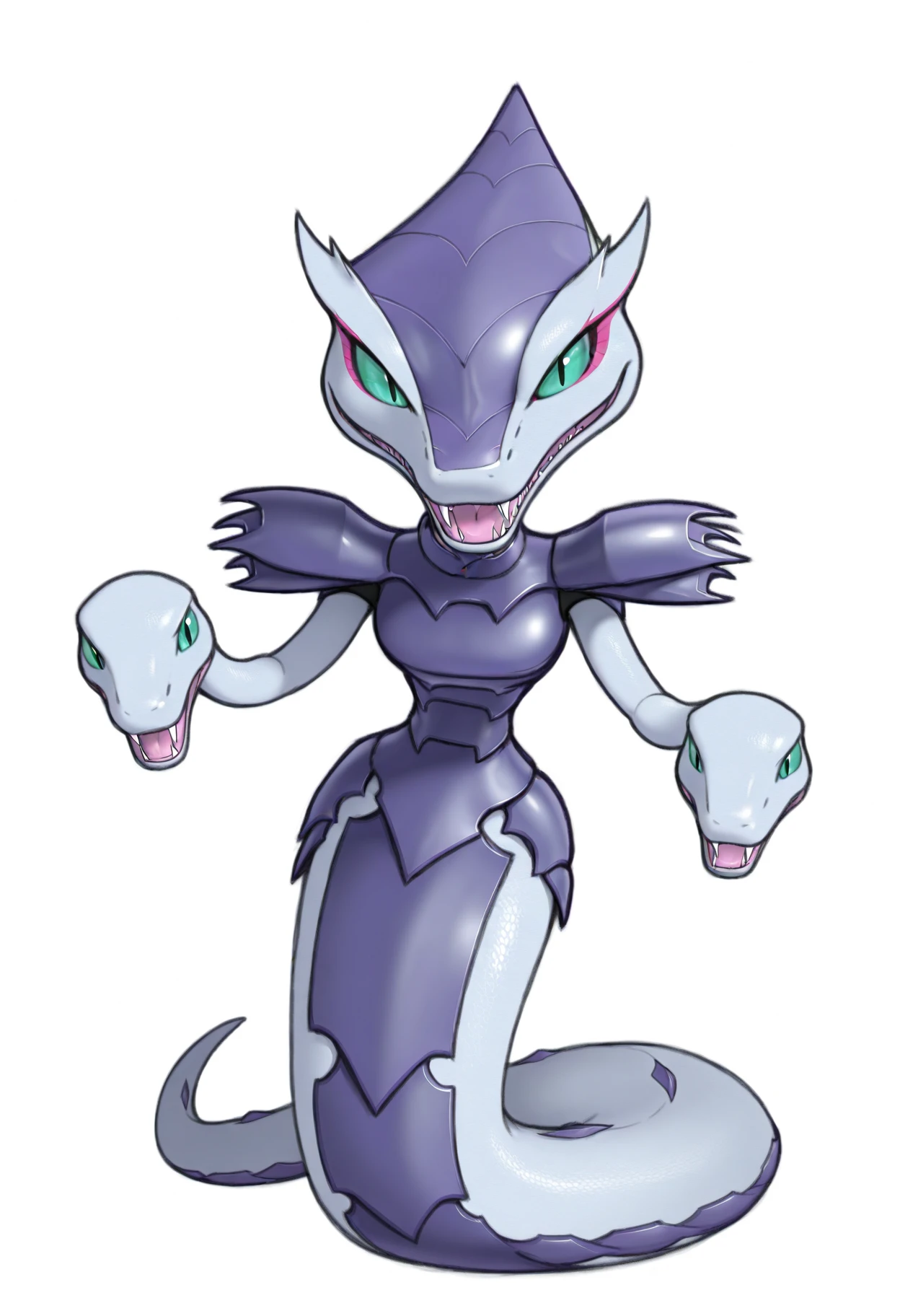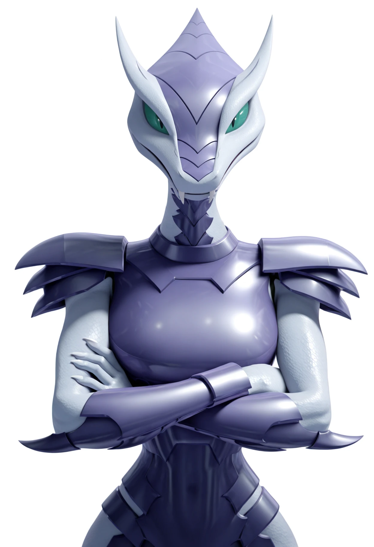 pokemon (creature), no humans, purple armor, green eyes, teeth, purple crest on head, humanoid serpent, snake tail, white scales