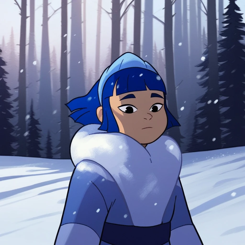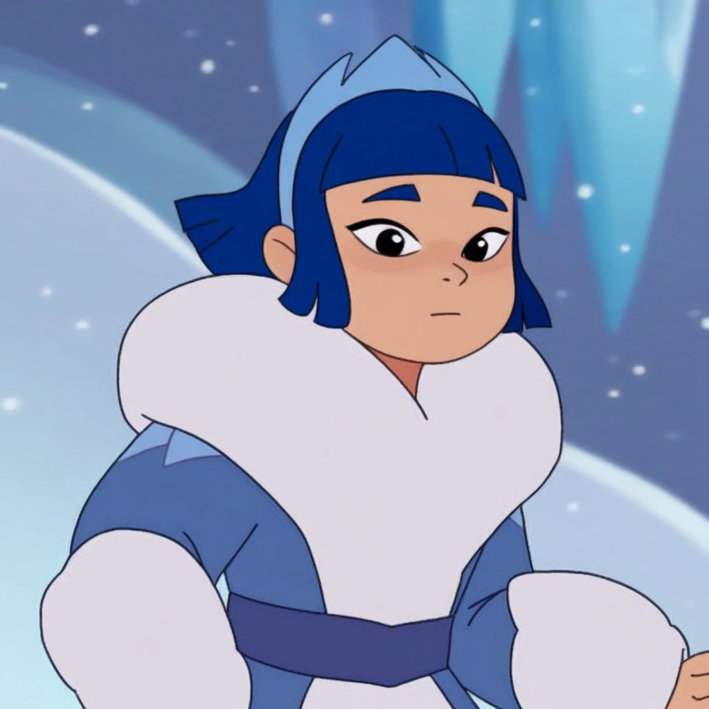 frosta, blue hair, blunt bangs, black eyes, fur trim