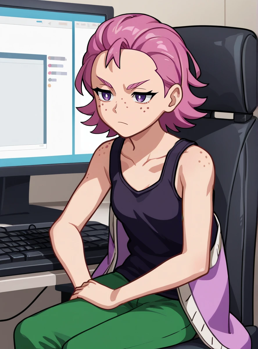 Tied Hair:solo, tiedhairdot, 1girl, pink hair, short hair, , green pants, pants, tank top, sitting,, open jacket, purple eyes, freckles, forehead, hairband