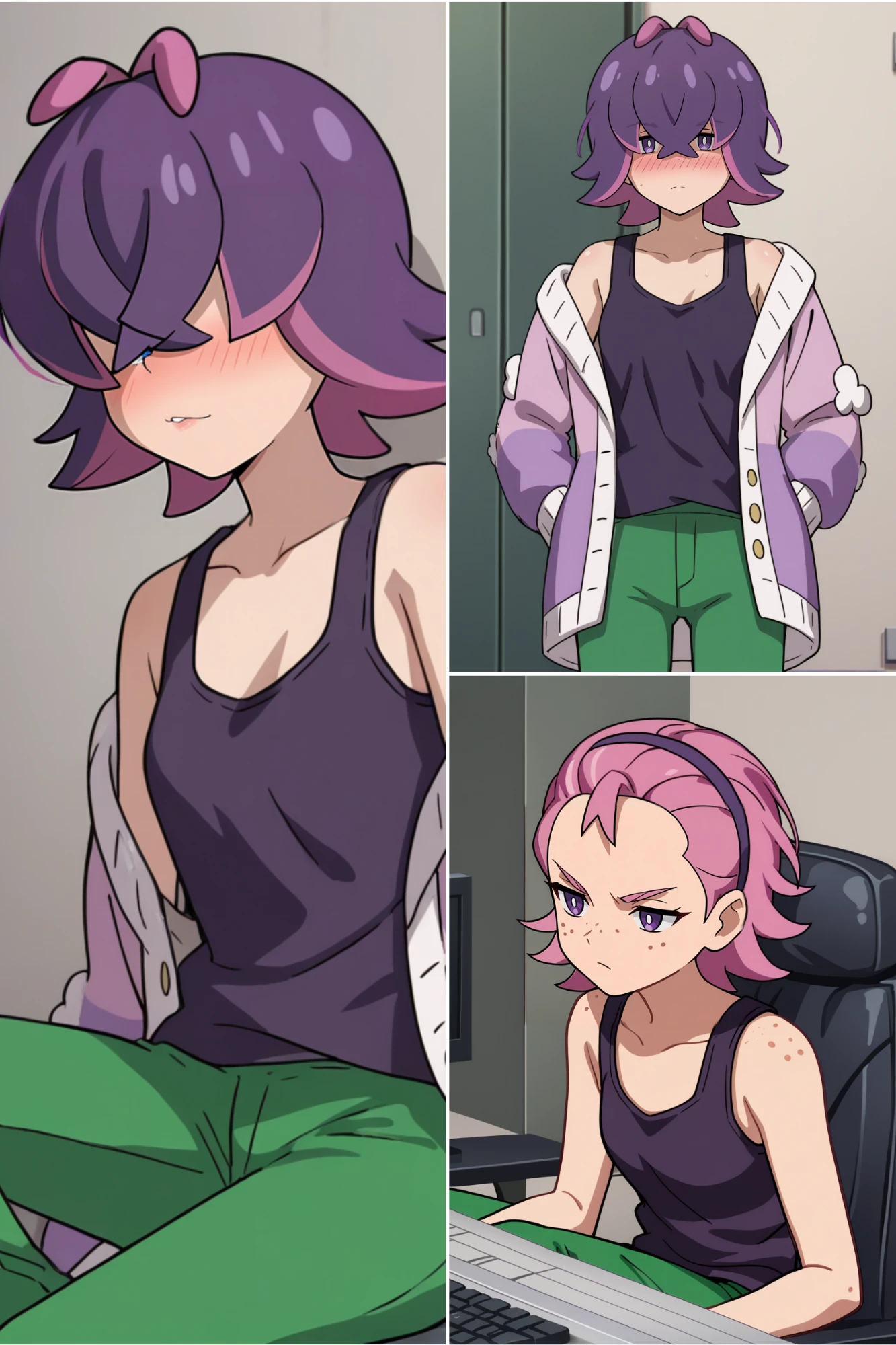 Regular hair: pokeanidot solo, , 1girl, purple hair, multicolored hair, short hair, hair over eyes, green pants, pants, tank top, sitting,, expressionless, open jacket,(Optional: Purple Eyes)