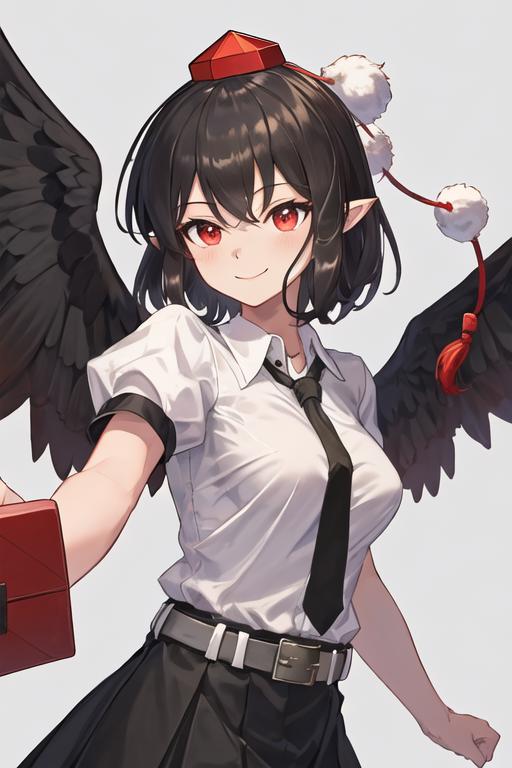 The trigger word is shameimaru_aya_touhou, and the recommended tags are best quality, masterpiece, highres, solo, {shameimaru_aya_touhou:1.15}, short_hair, hat, black_hair, tokin_hat, red_eyes, bangs, red_headwear, smile, wings, black_wings, ribbon, upper_body, hair_between_eyes, pointy_ears, breasts.