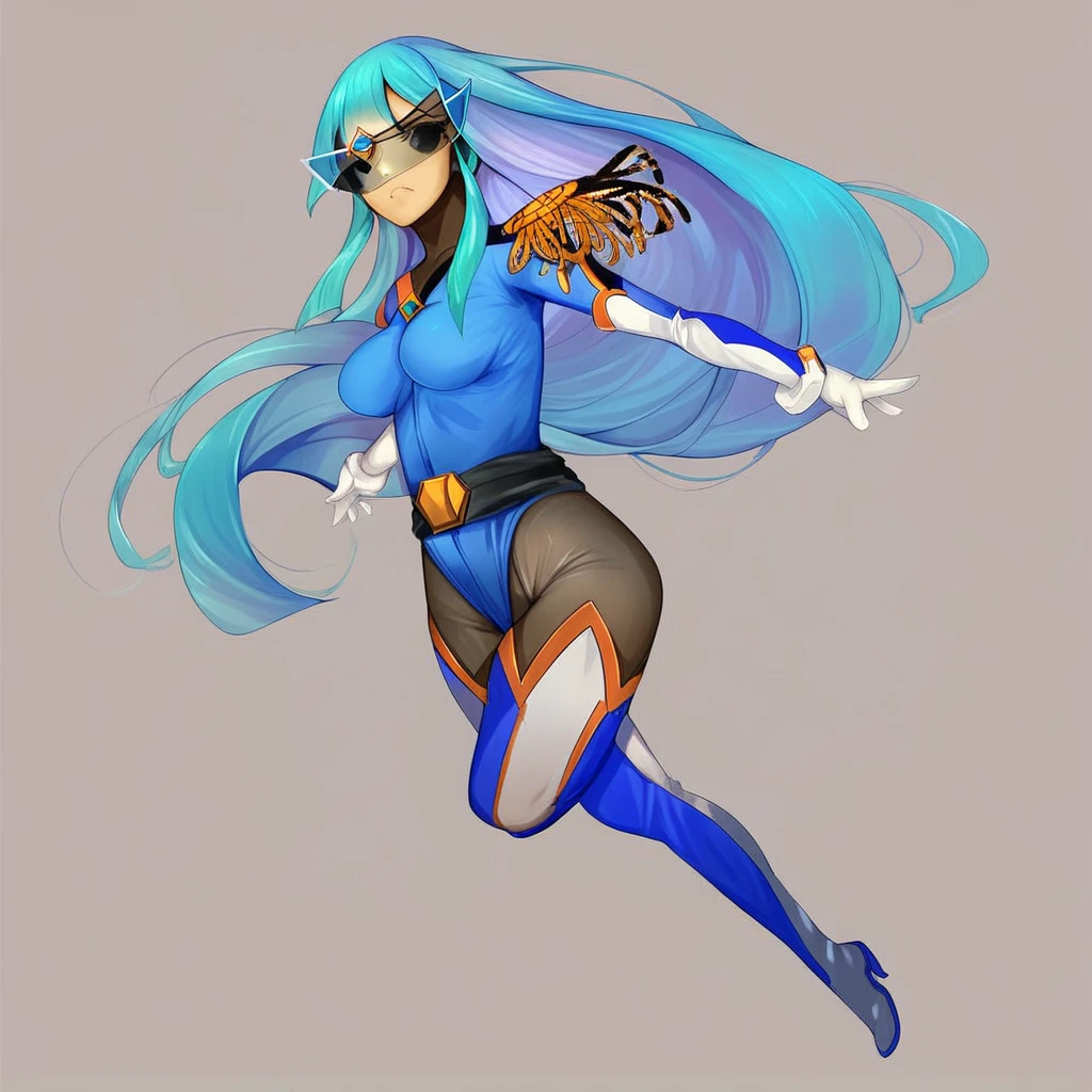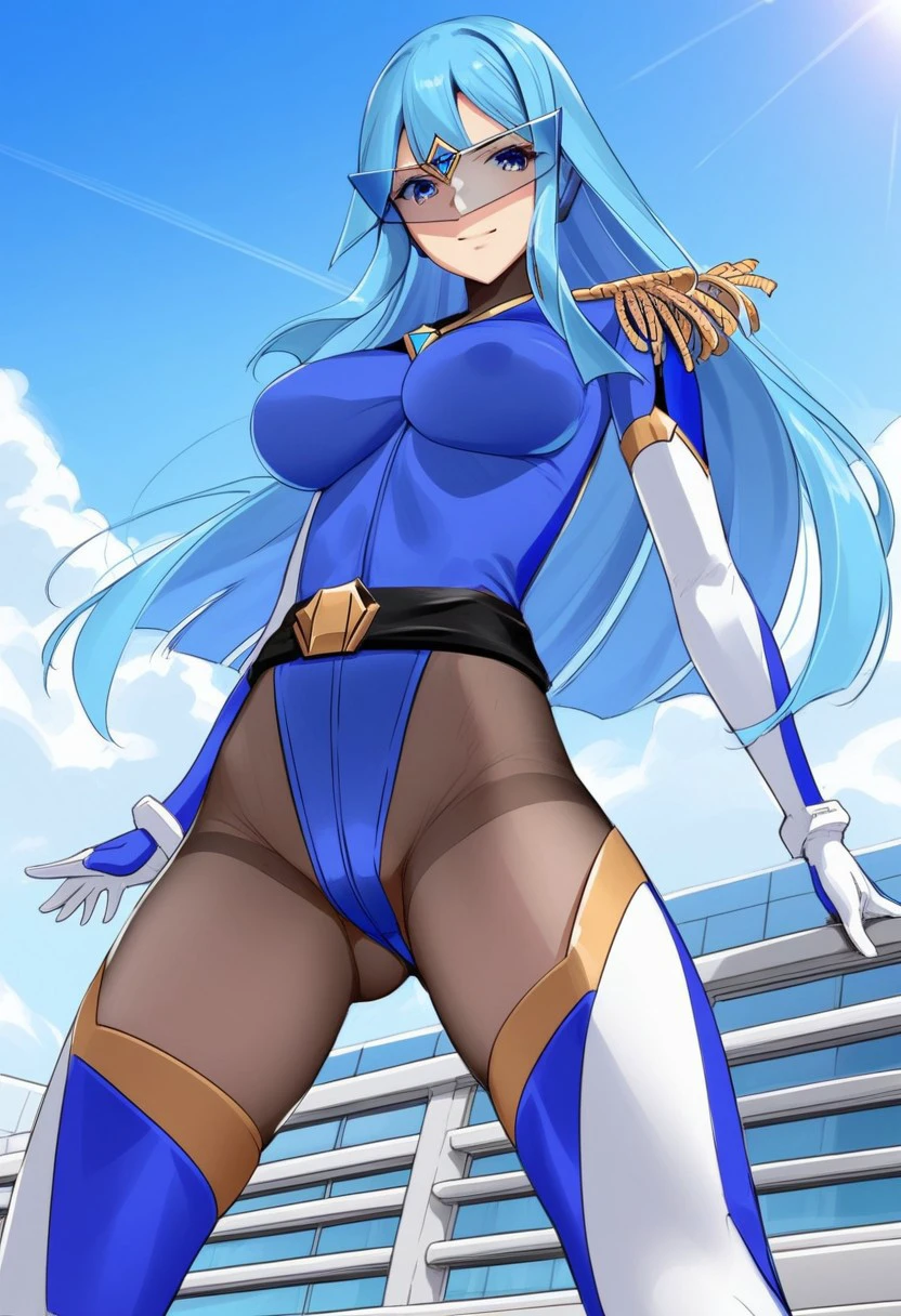 airi, henshin suit, blue hair, long hair, visor, multicolored elbow gloves, blue leotard, black belt, black skin tight, single epaulet, multicolored thigh boots, blue highheels, large breasts,
