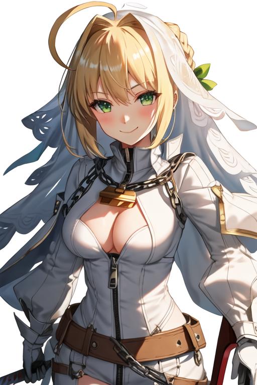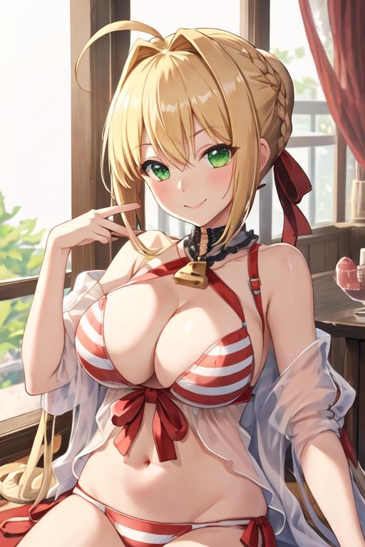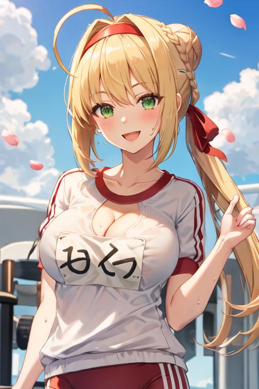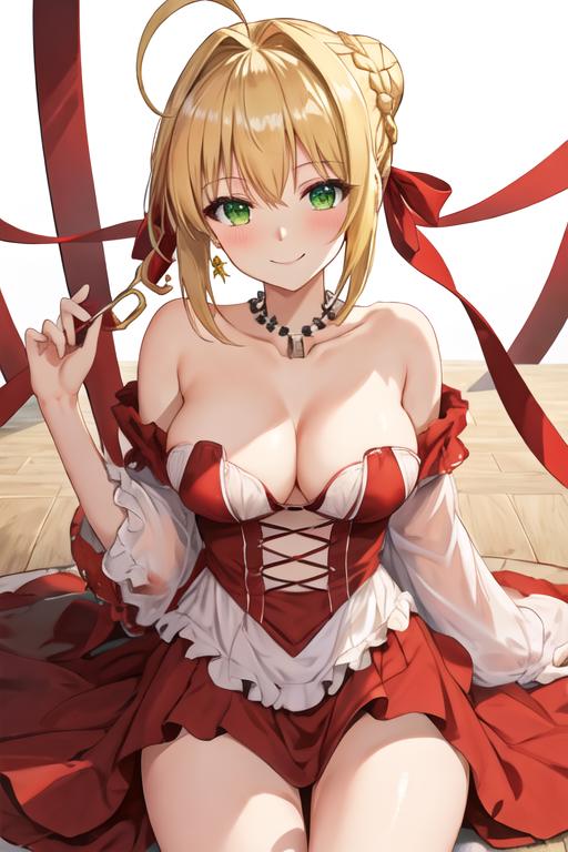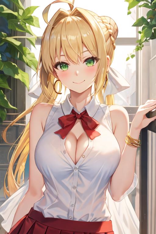 The trigger word is nero_claudius_fgo, and the recommended tags are best quality, masterpiece, highres, solo, {nero_claudius_fgo:1.15}, blonde_hair, ahoge, green_eyes, hair_intakes, breasts, bangs, smile, large_breasts, blush, cleavage, braid, hair_between_eyes, long_hair.