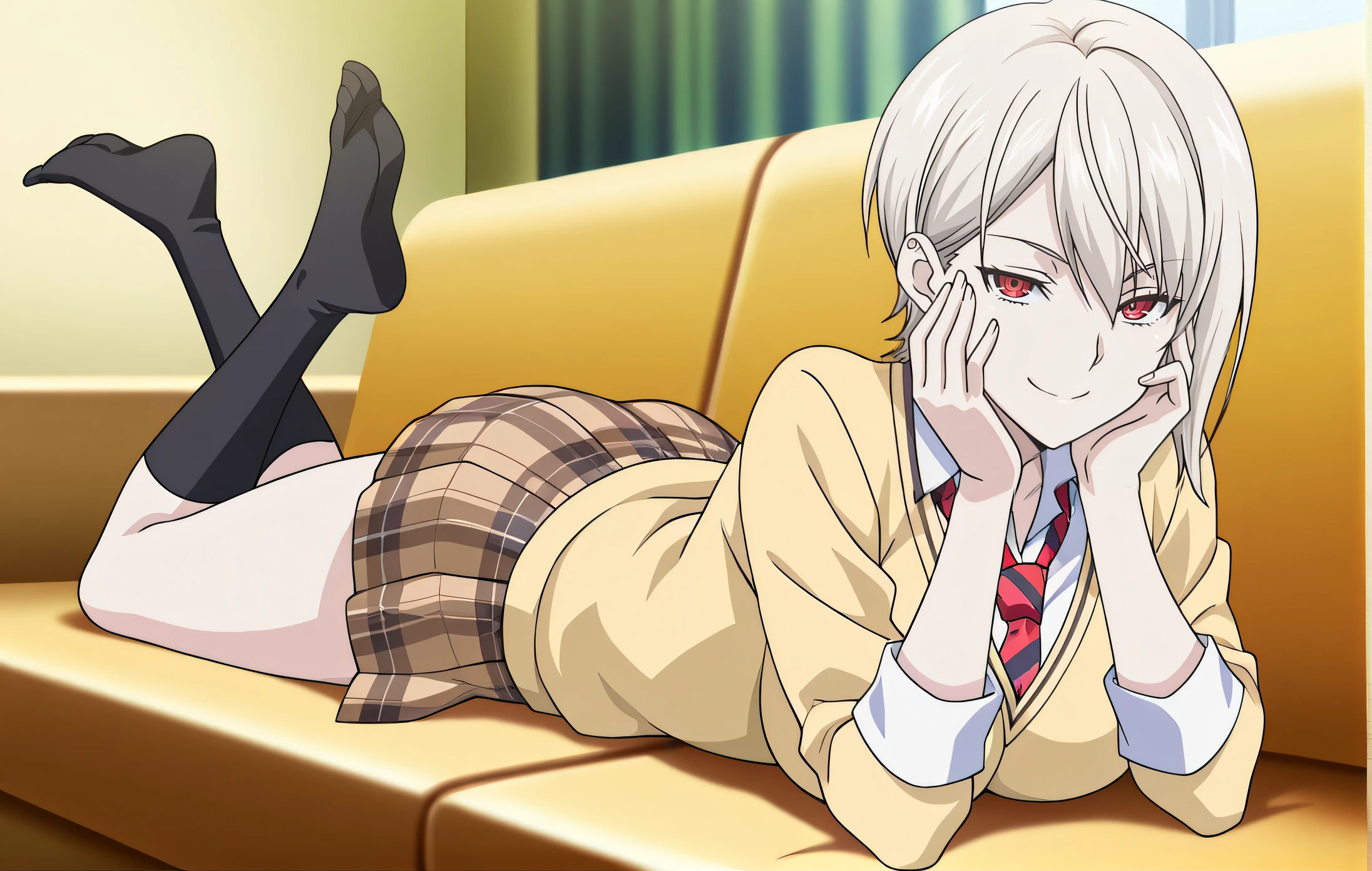 school uniform, yellow sweater, necktie, plaid skirt, black knee socks