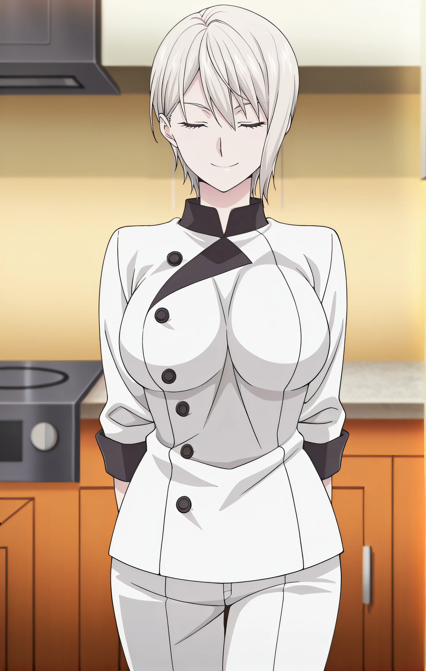 chef uniform, long sleeves, white pants