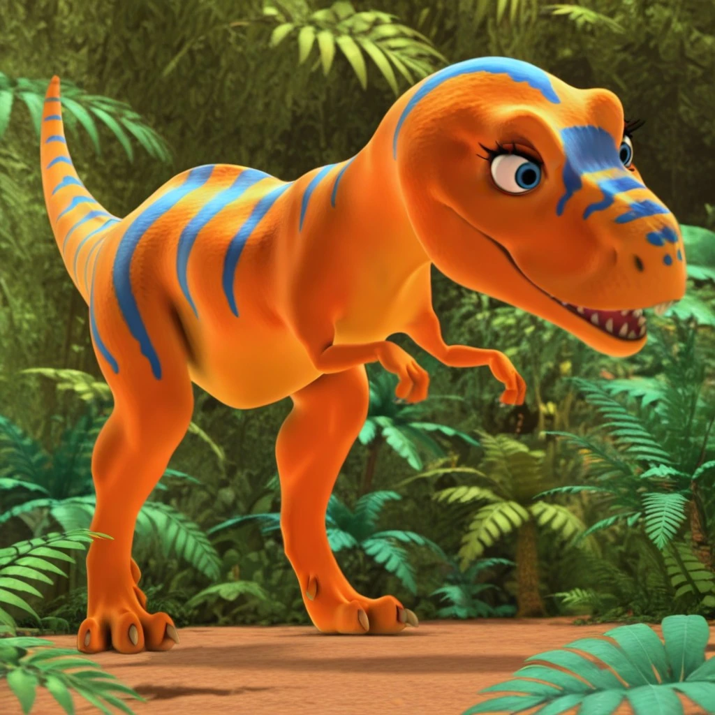 DTDoloresil, feral, female, T-rex, orange skin, blue stripes, blue eyes, eyelashes, 1girl,