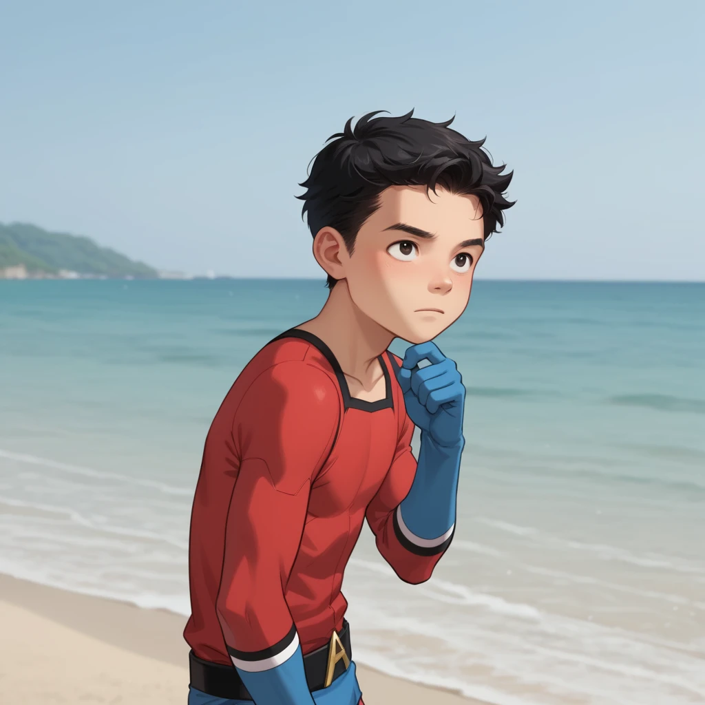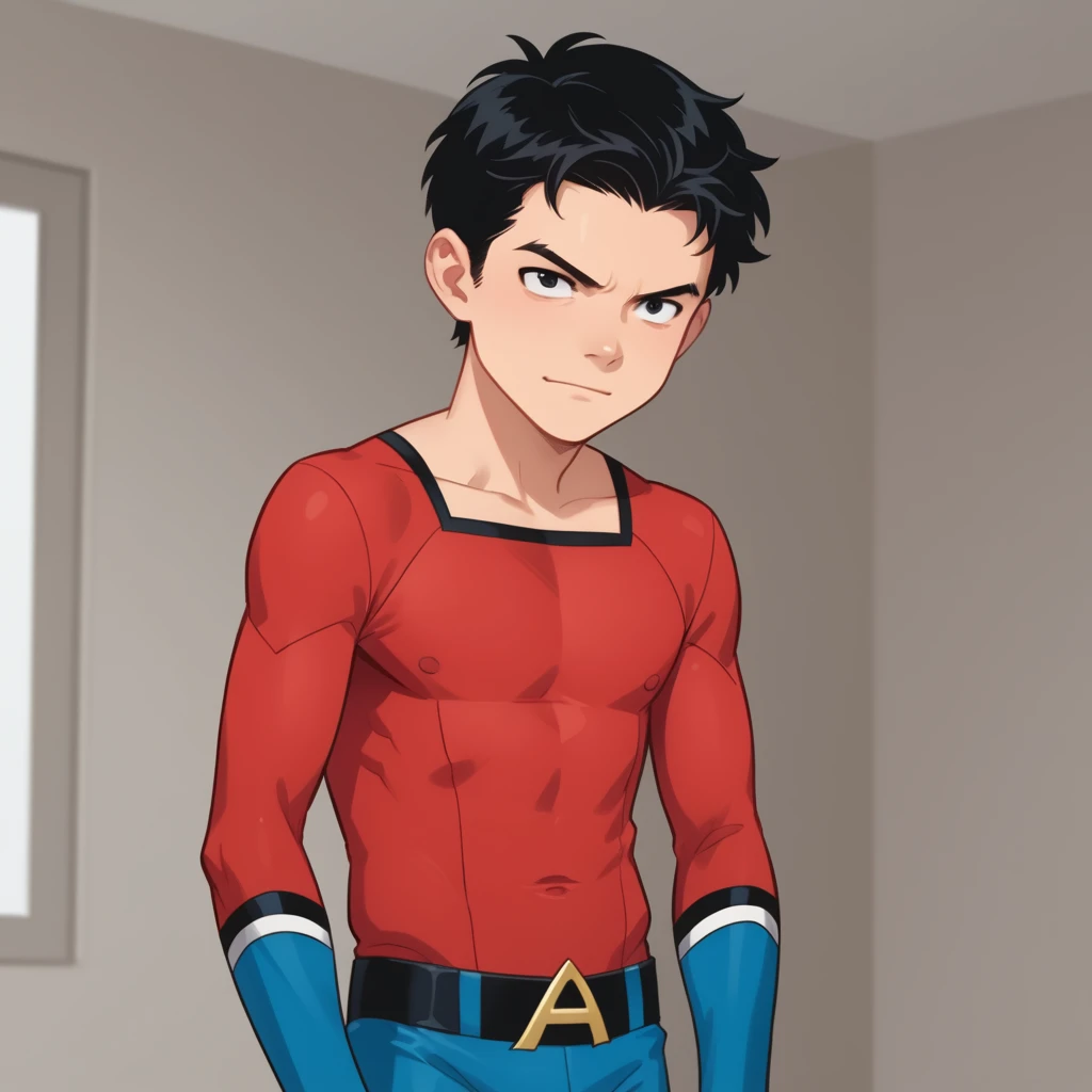 belt, black hair, red shirt, gloves, blue speedo, male swimwear, superhero, blue gloves, red scale shirt