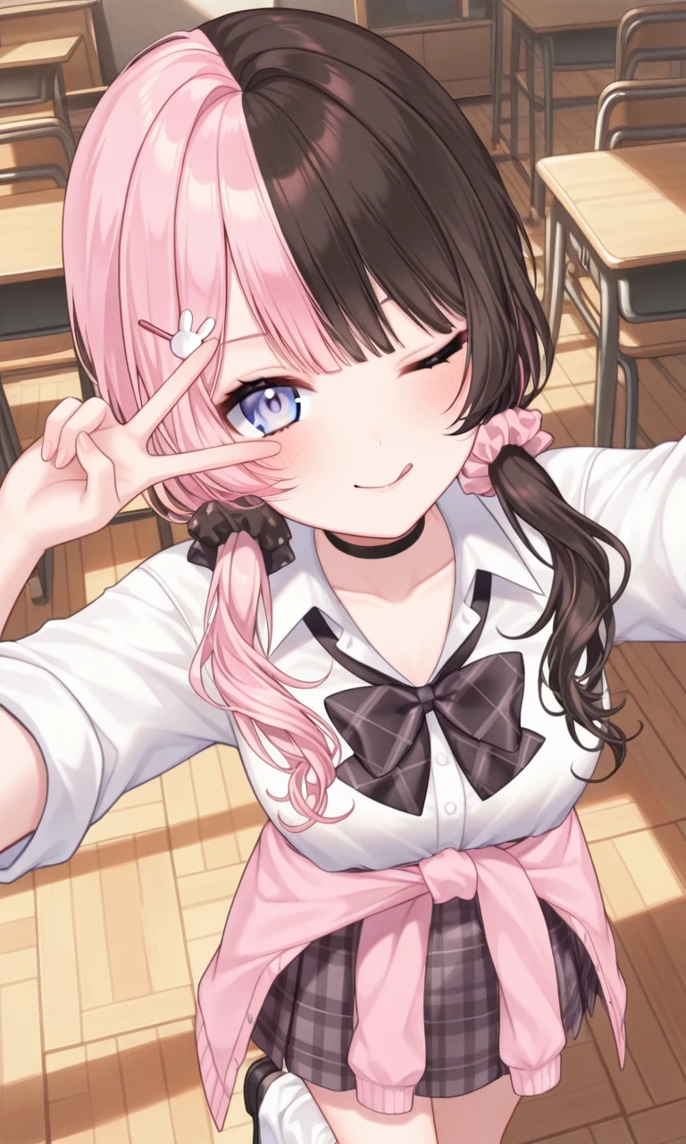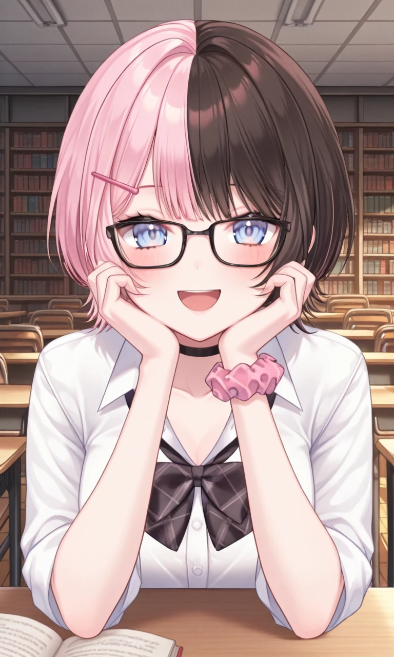 low twintails, hair over shoulders, hair scrunchie, pink scrunchie, black scrunchie, rabbit hairclipShort hair :