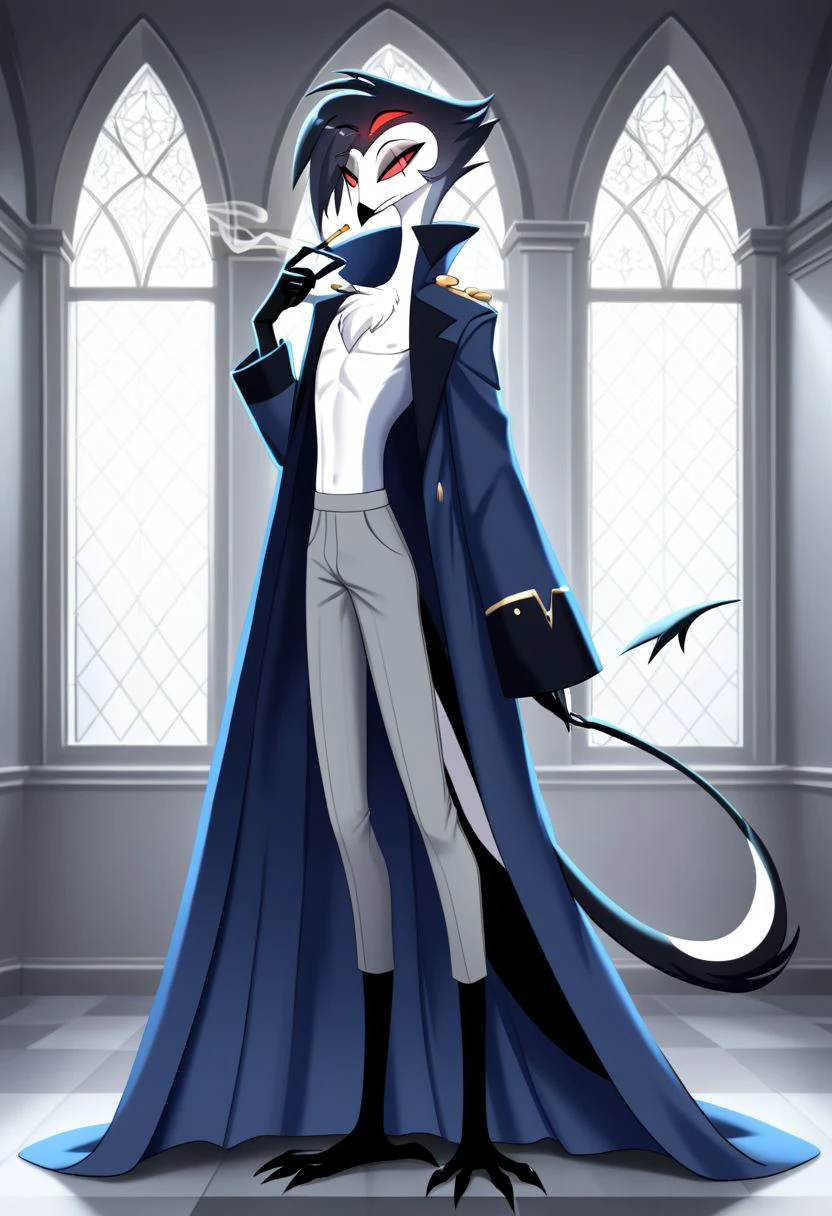 General: stolas \(helluva boss\), chest tuft, grey fur, short hair, black hair, white face, girly, skinny, black legs, black hands, tail, red eyes, four eyes, extra eyes