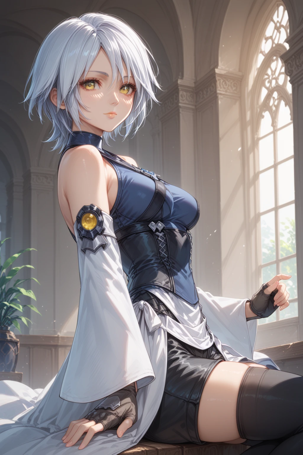 • gloves, long sleeves, bare shoulders, boots, detached sleeves, shorts, wide sleeves, fingerless gloves, black footwear, black shorts, knee boots, pants, corset