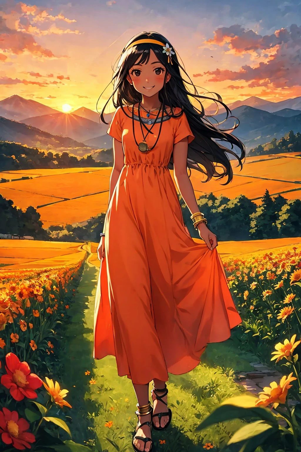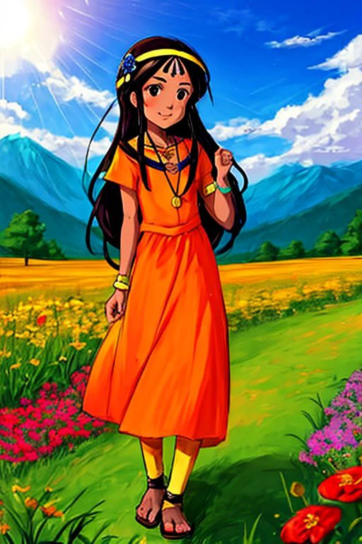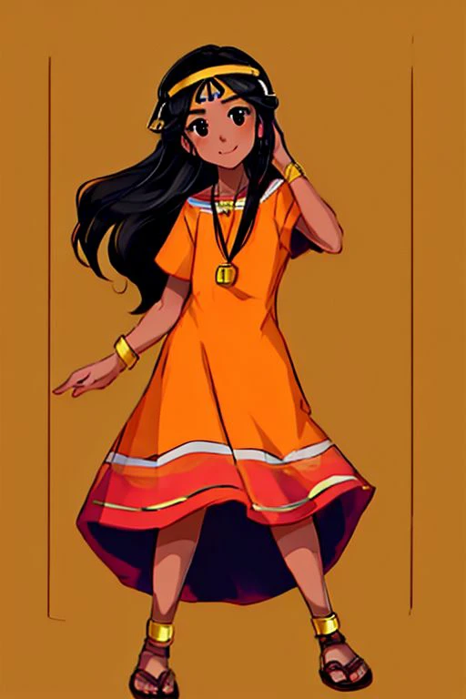 Trigger words: dark skin, long hair, dress, sandals, anklet, bracelet, necklace, black eyes, black hair, hairband