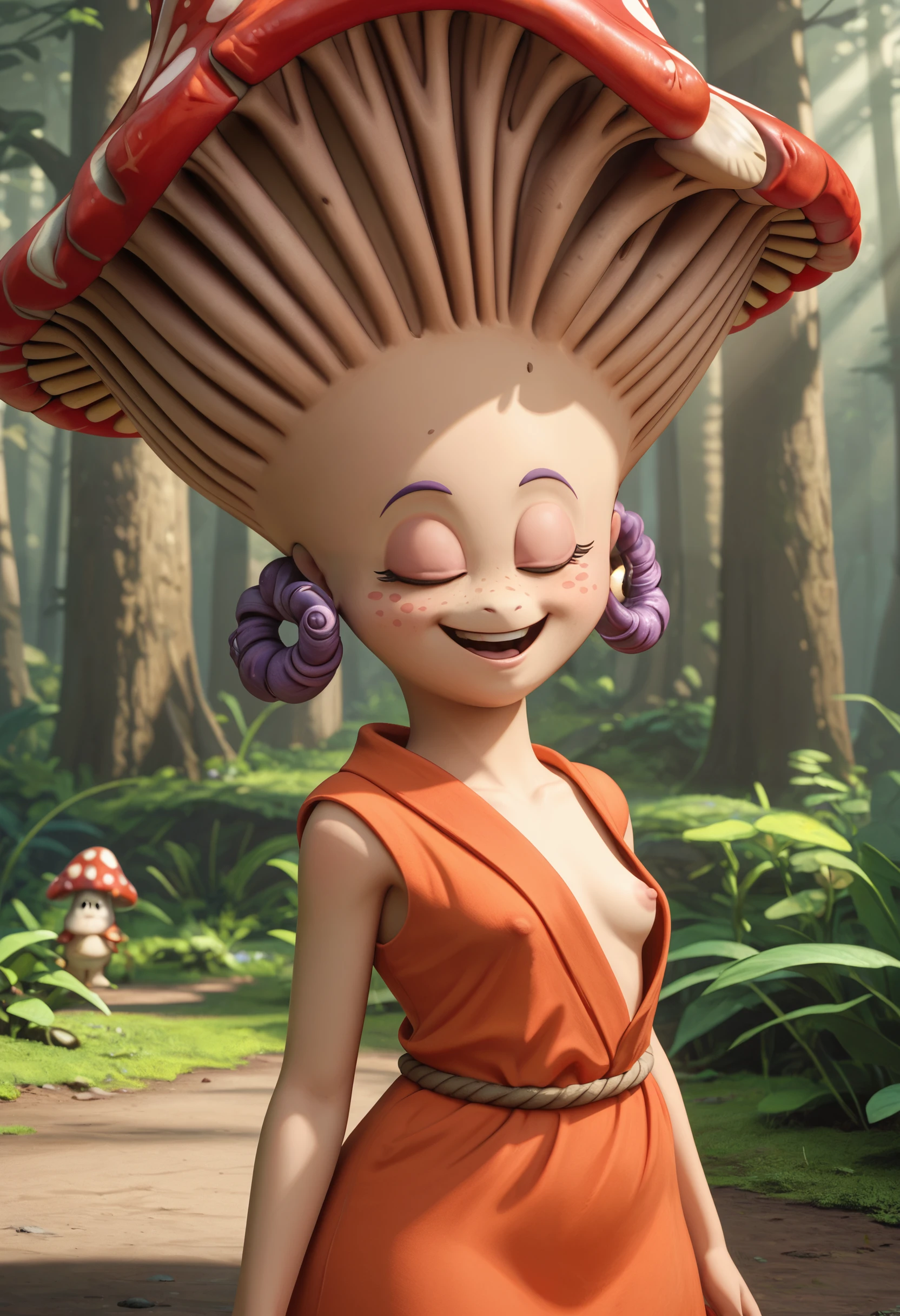 Masterpiece, score_9, score_8_up, mush-mush, mushroom, anthropomorphic mushroom, cute character with a wide mushroom cap, smiling, wearing a green scarf, standing in a vibrant forest, soft warm lighting, surrounded by colorful flowers, whimsical and friendly atmospherePlayful Mushroom Explorer: