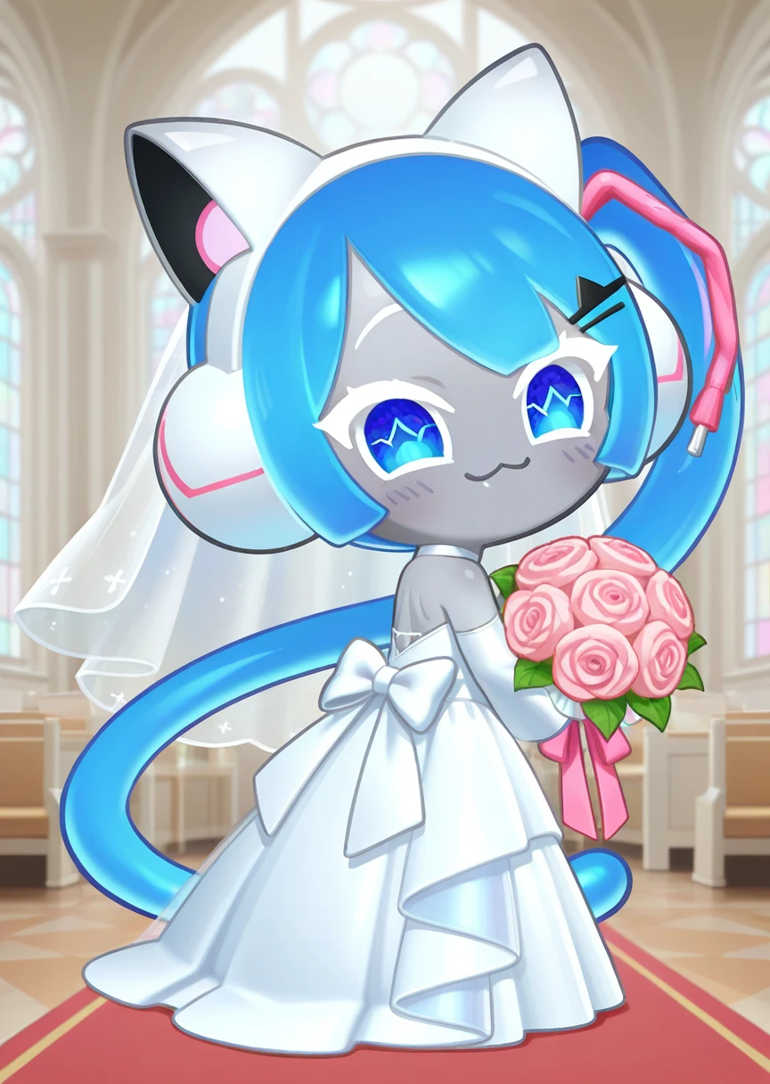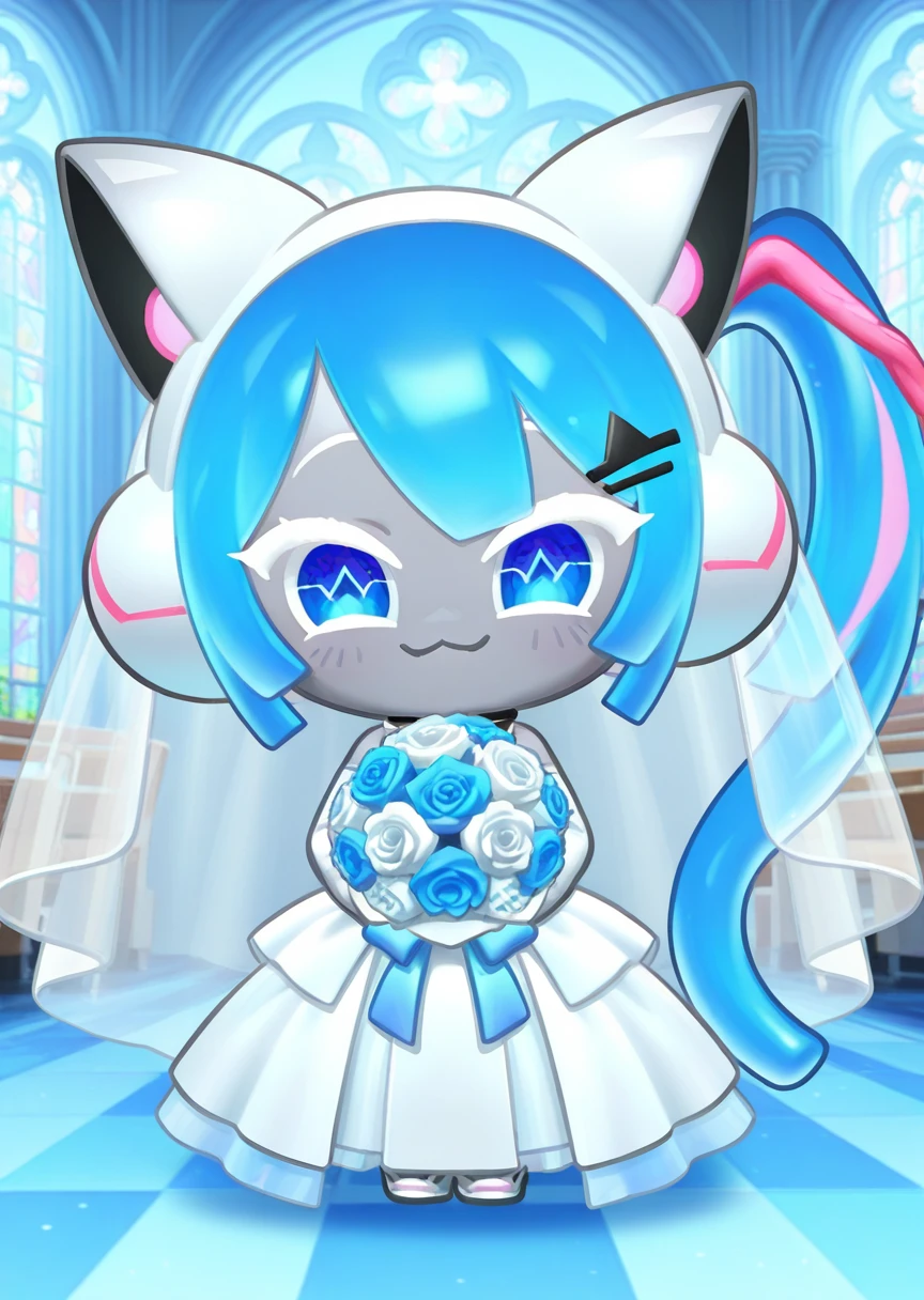 prompts: djmiya, chibi, white headset, blue hair, side ponytail, blue eyes, symbol in eye, jacket, long sleeves, black bike shorts, black footwear, white legwear, grey skin, dot eyes, hair ornament, long hair,