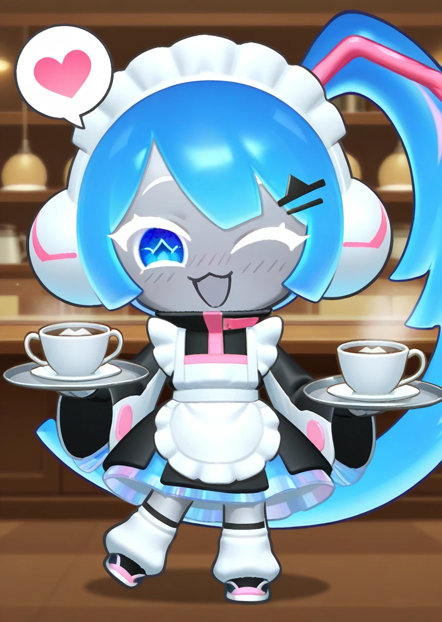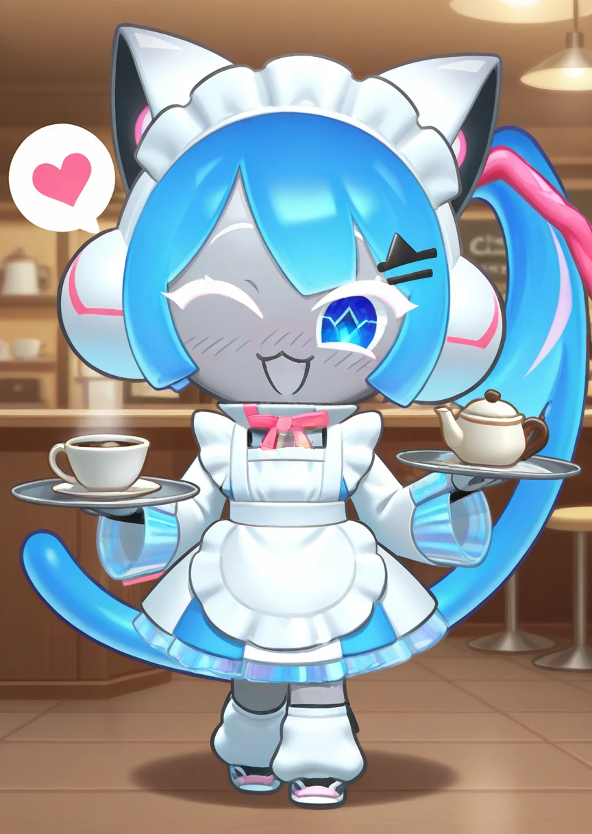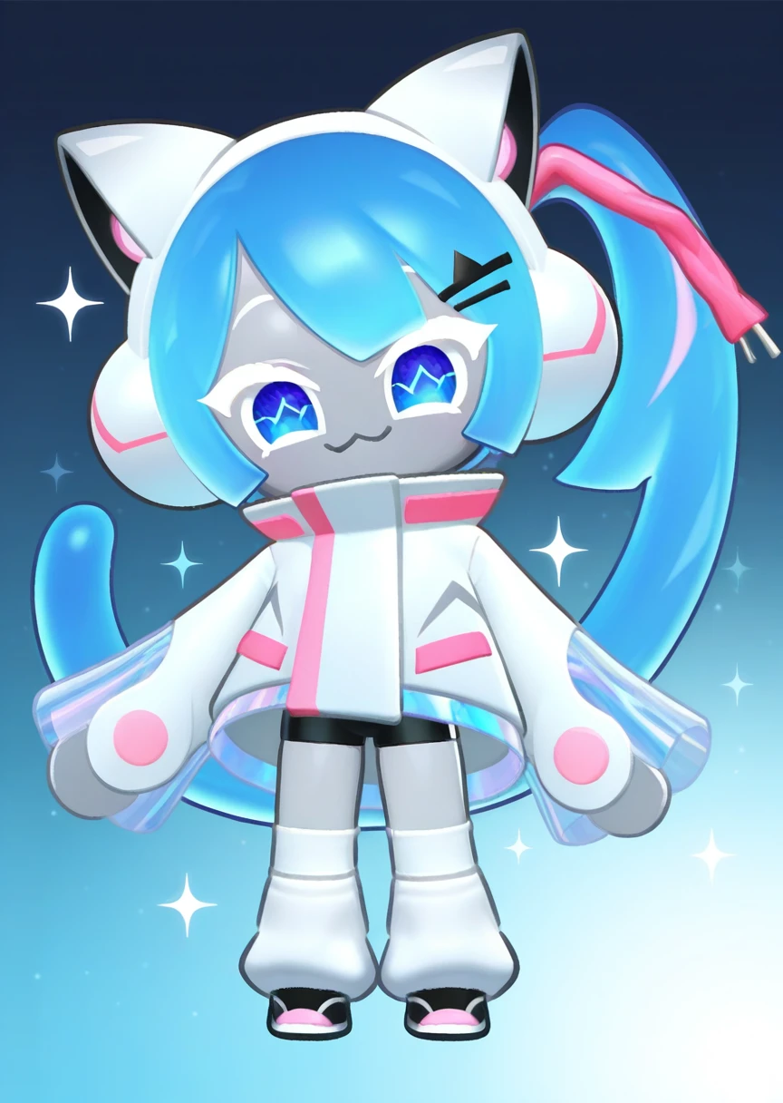 djmiya, chibi, white headset, blue hair, side ponytail, blue eyes, symbol in eye, jacket, long sleeves, black bike shorts, black footwear, white legwear, grey skin, dot eyes, hair ornament, long hair,