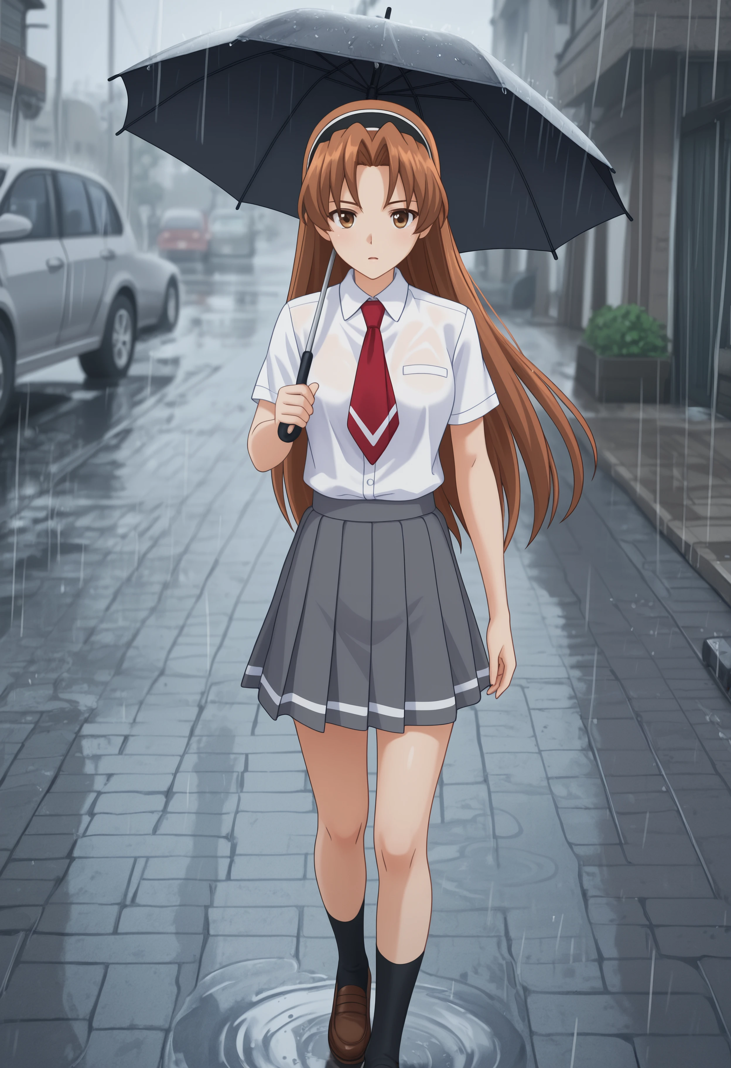brown hair, long hair, hairband, brown eyes,