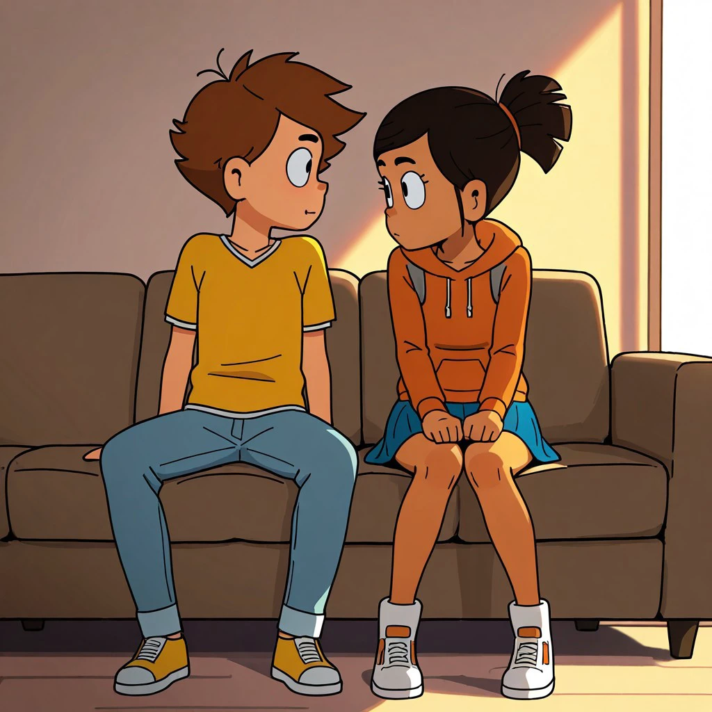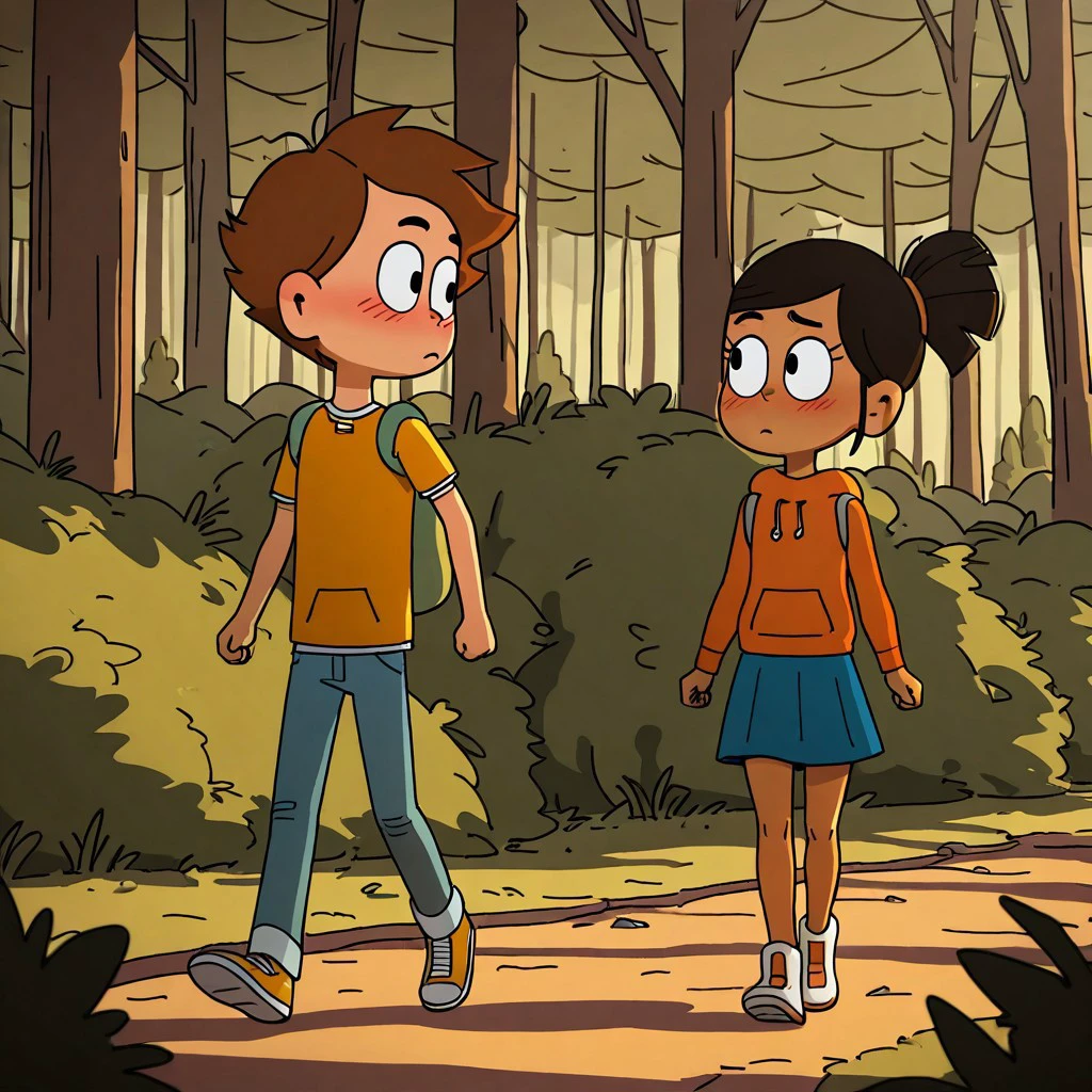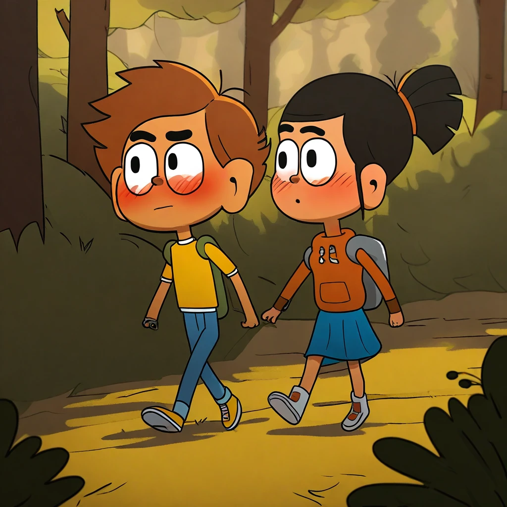 natlika, (1boy, nate, brown hair, shirt, pants), break, (1girl, dark-skinned female, malika, black hair, hoodie, skirt)