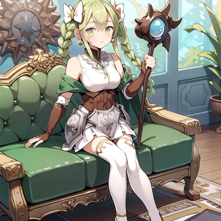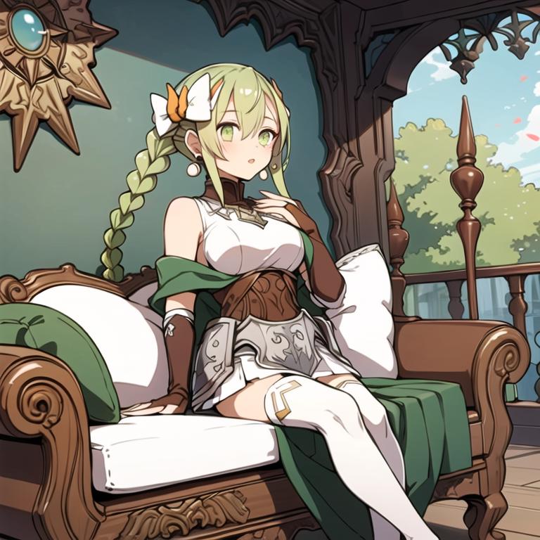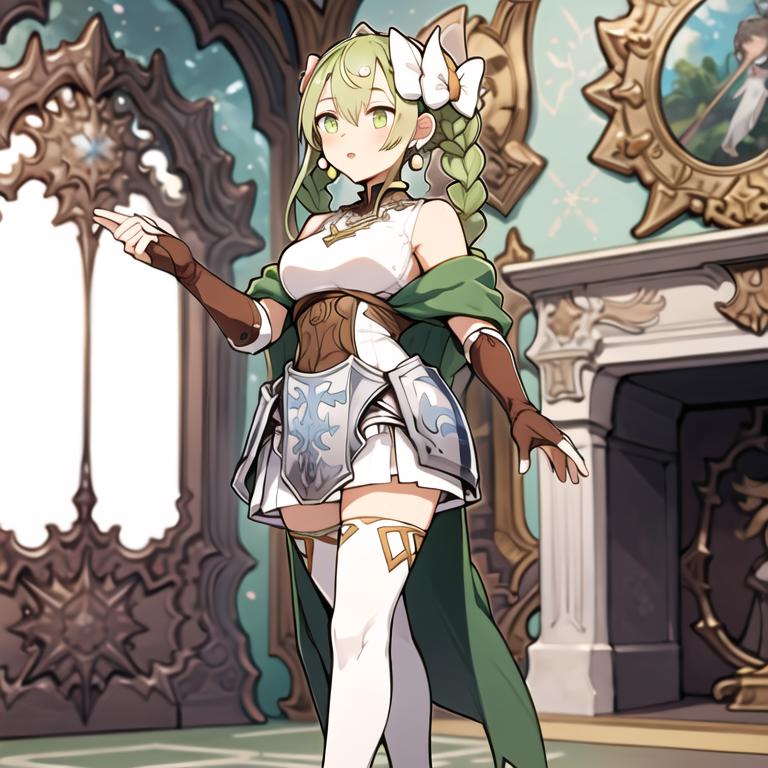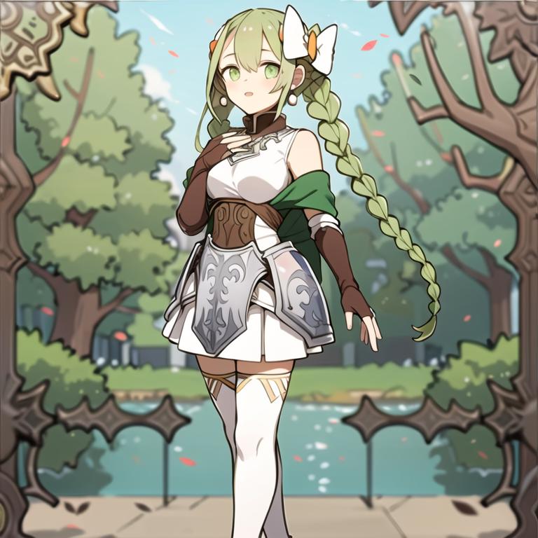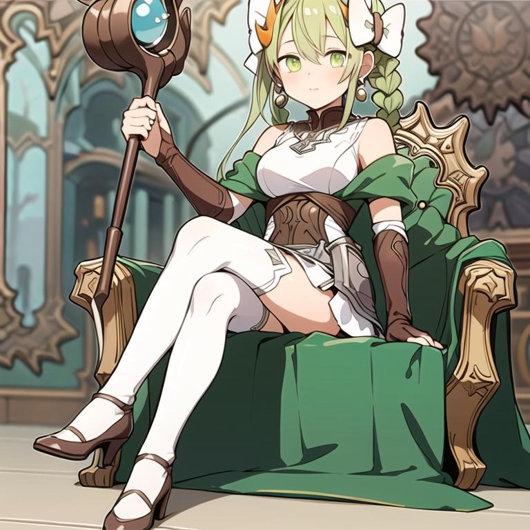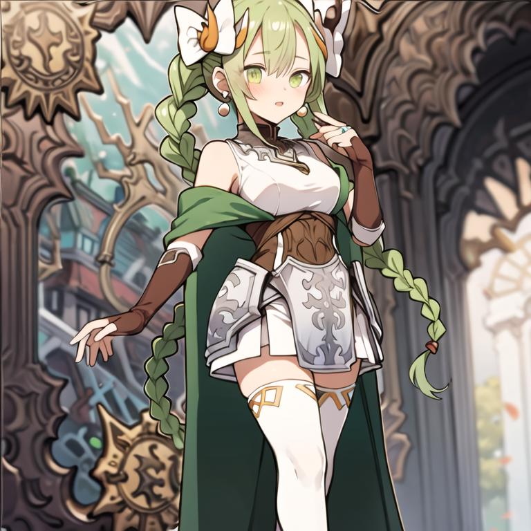 Hair/Characteristics: long hair, hair ornament, green eyes, sidelocks, jewelry, earrings, green hair, hair bow, hair between eyes, braid, up, twin braids, white bow