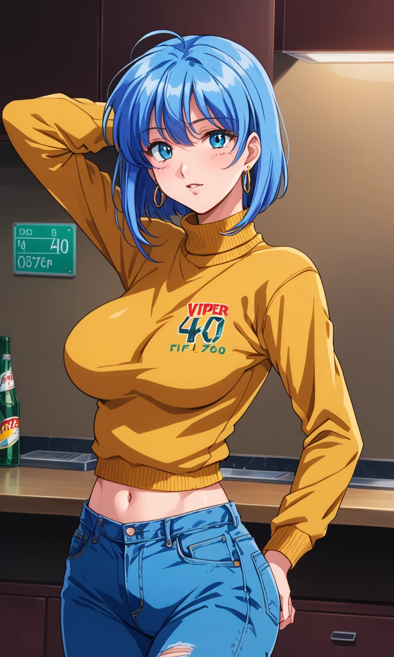 1woman, 22 years old, (lilia milcrabe), bangs, sidelocks, (Blue hair), (Short hair), (aqua eyes), medium breasts, medium ass, Earrings
